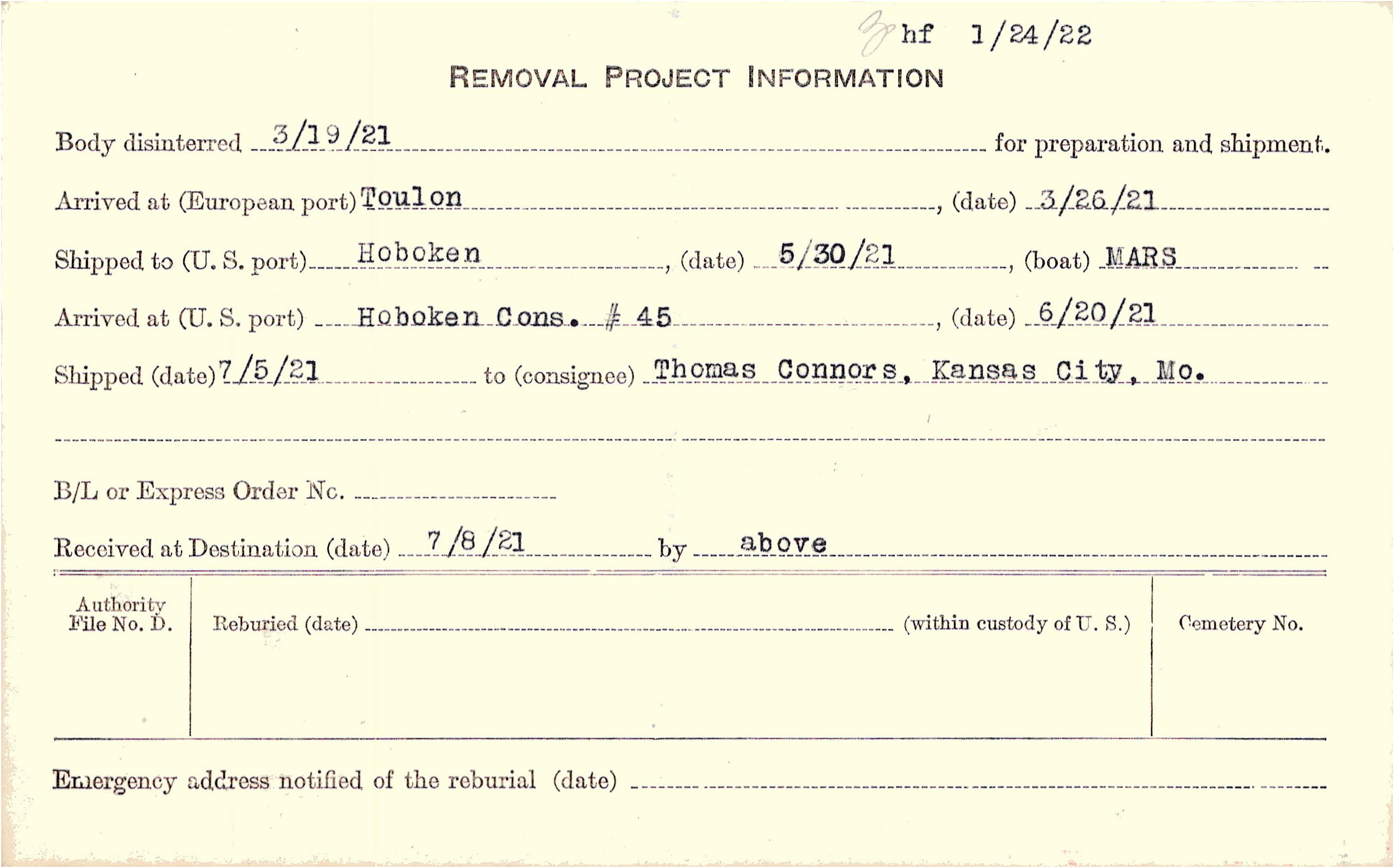 Body disinterred 3/19/1921 for preparation and shipment.