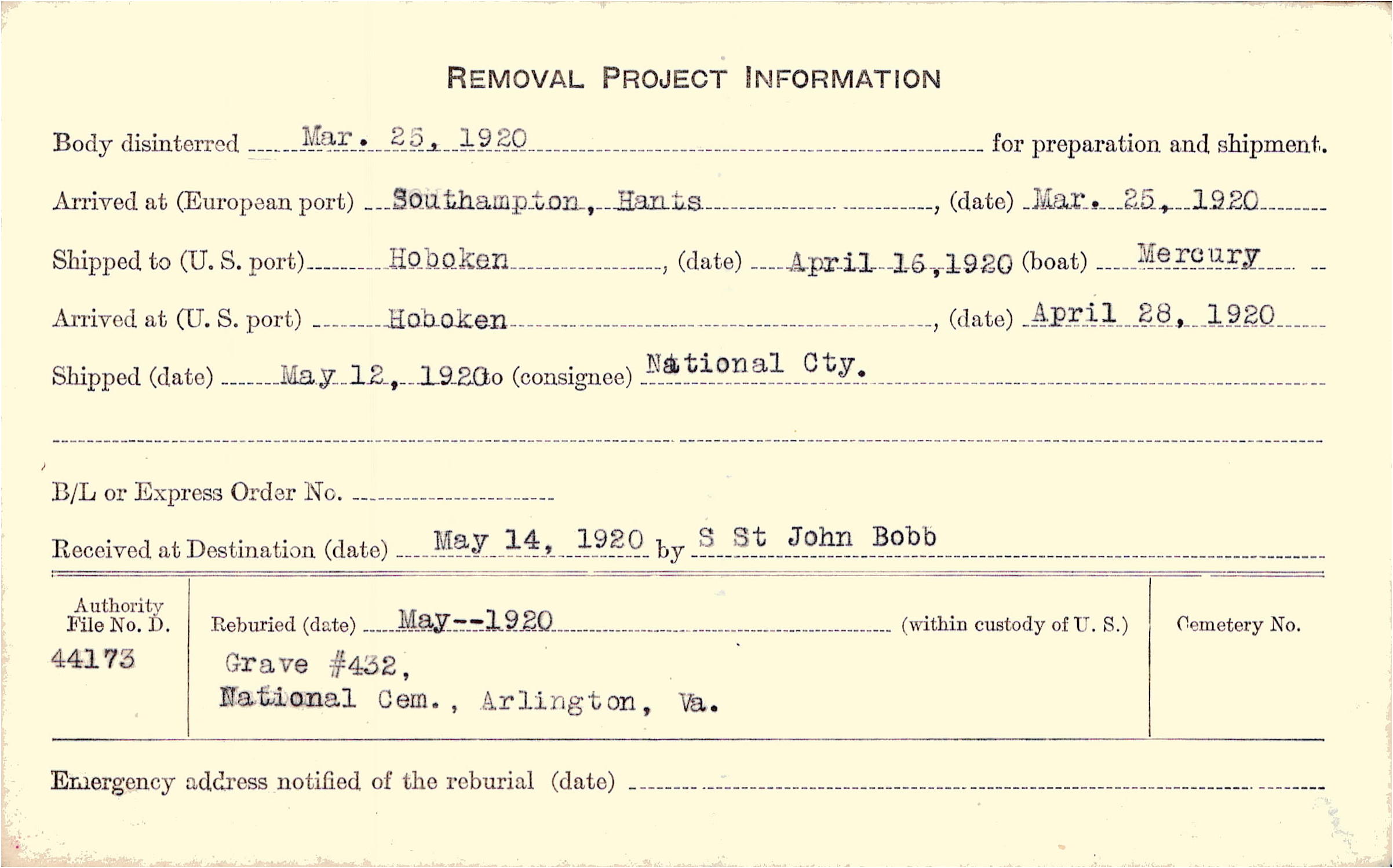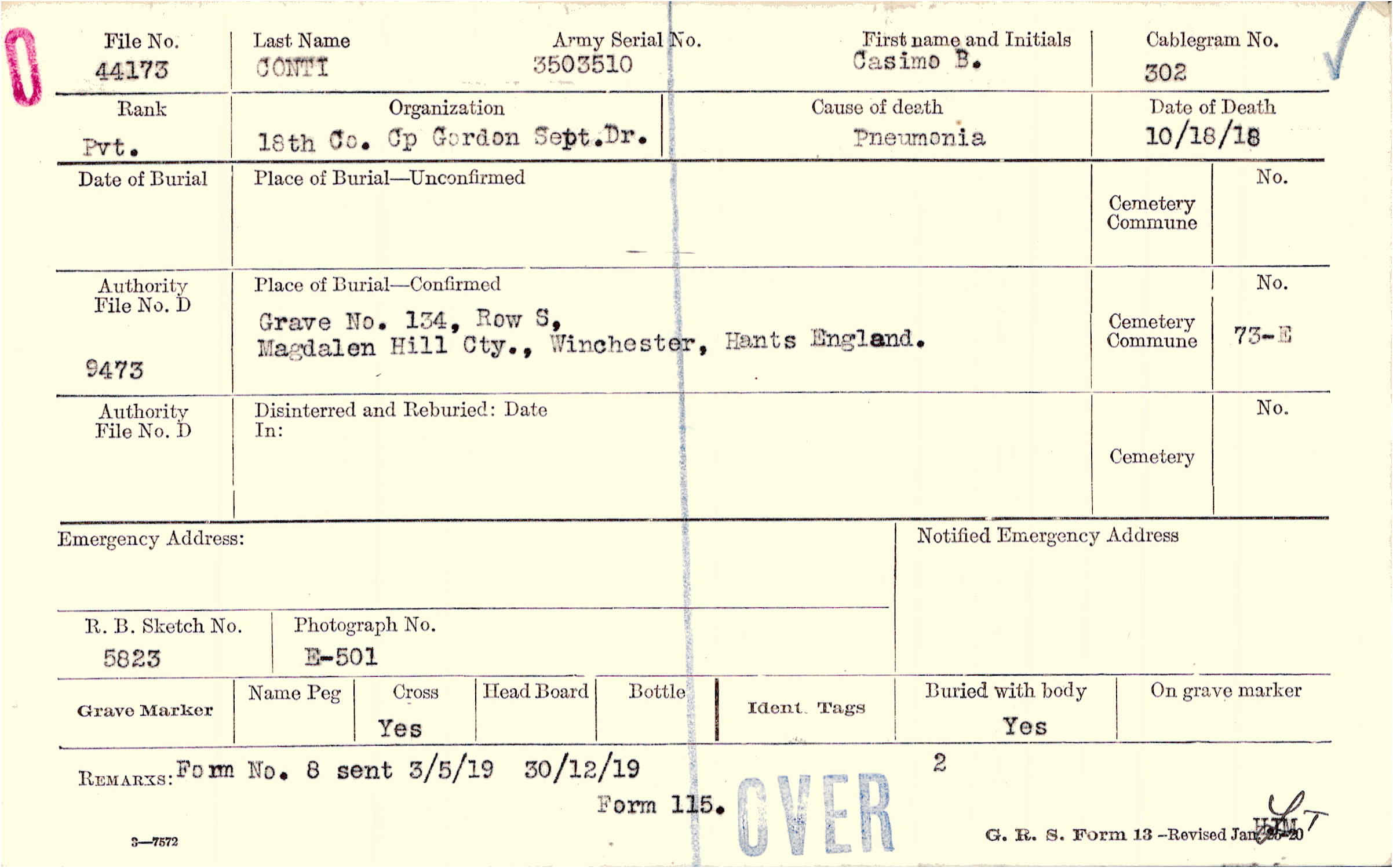 Grave 134, Row S, Magdalen Hill Cty., Winchester, Hants England.