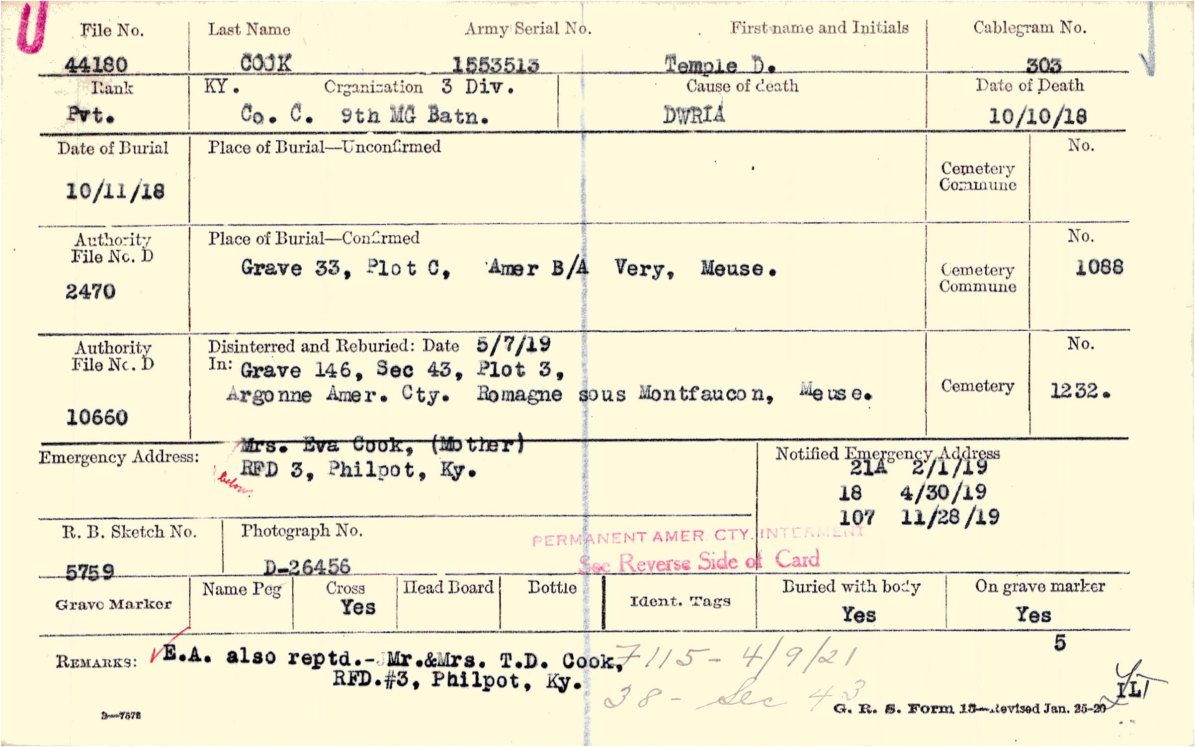 E.A. also reptd. - Mr. & Mrs. T.D. Cook, RFD. #3, Philpot, Ky., F115 - 4/9/21 38 - Sec 43