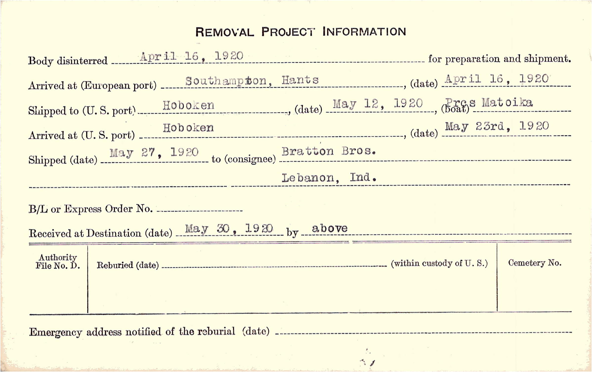Body disinterred 4/16/1920 for preparation and shipment.