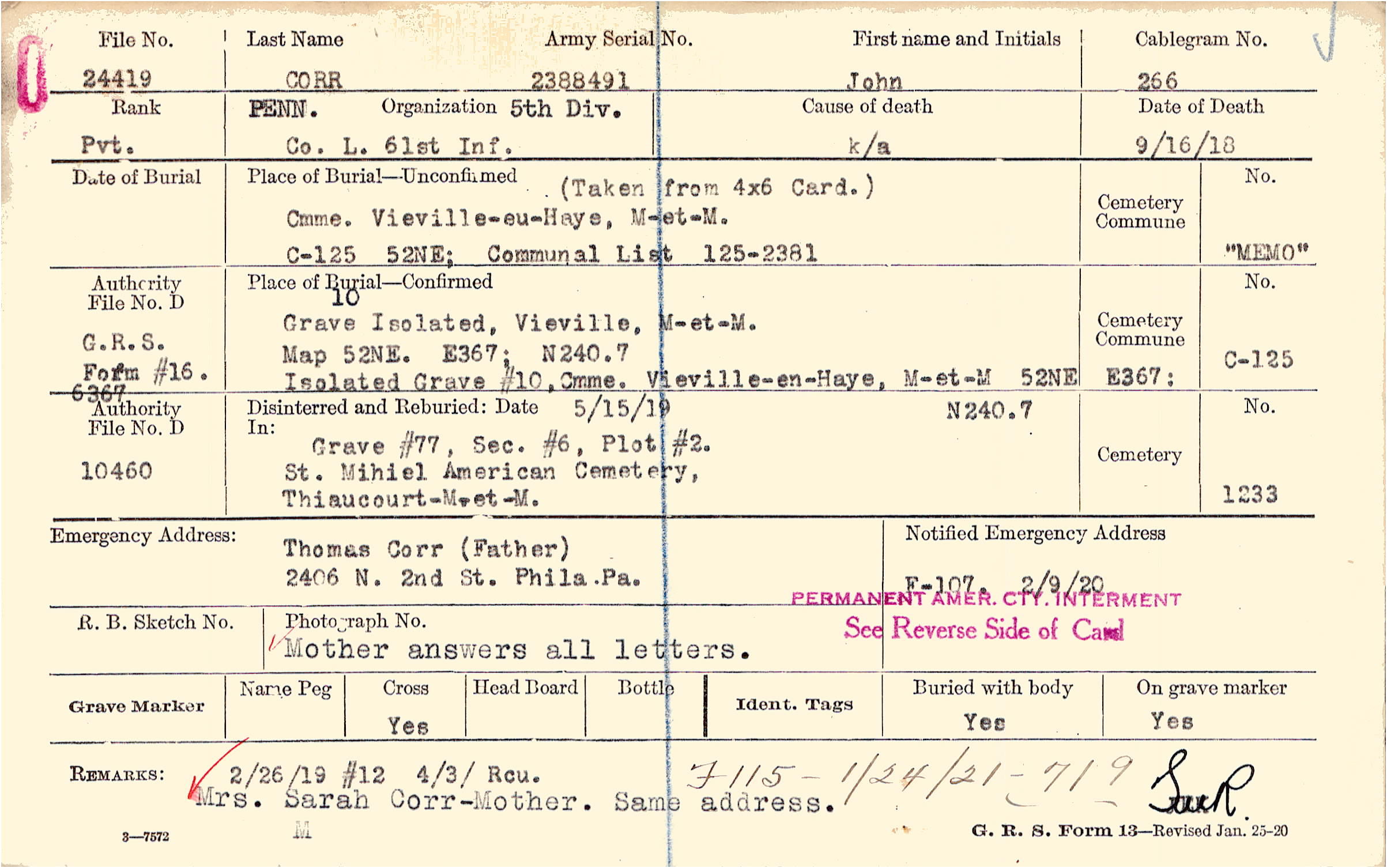 Thomas Corr (Father), 2406 N. 2nd St. Phila. Pa., Mother answers all letters