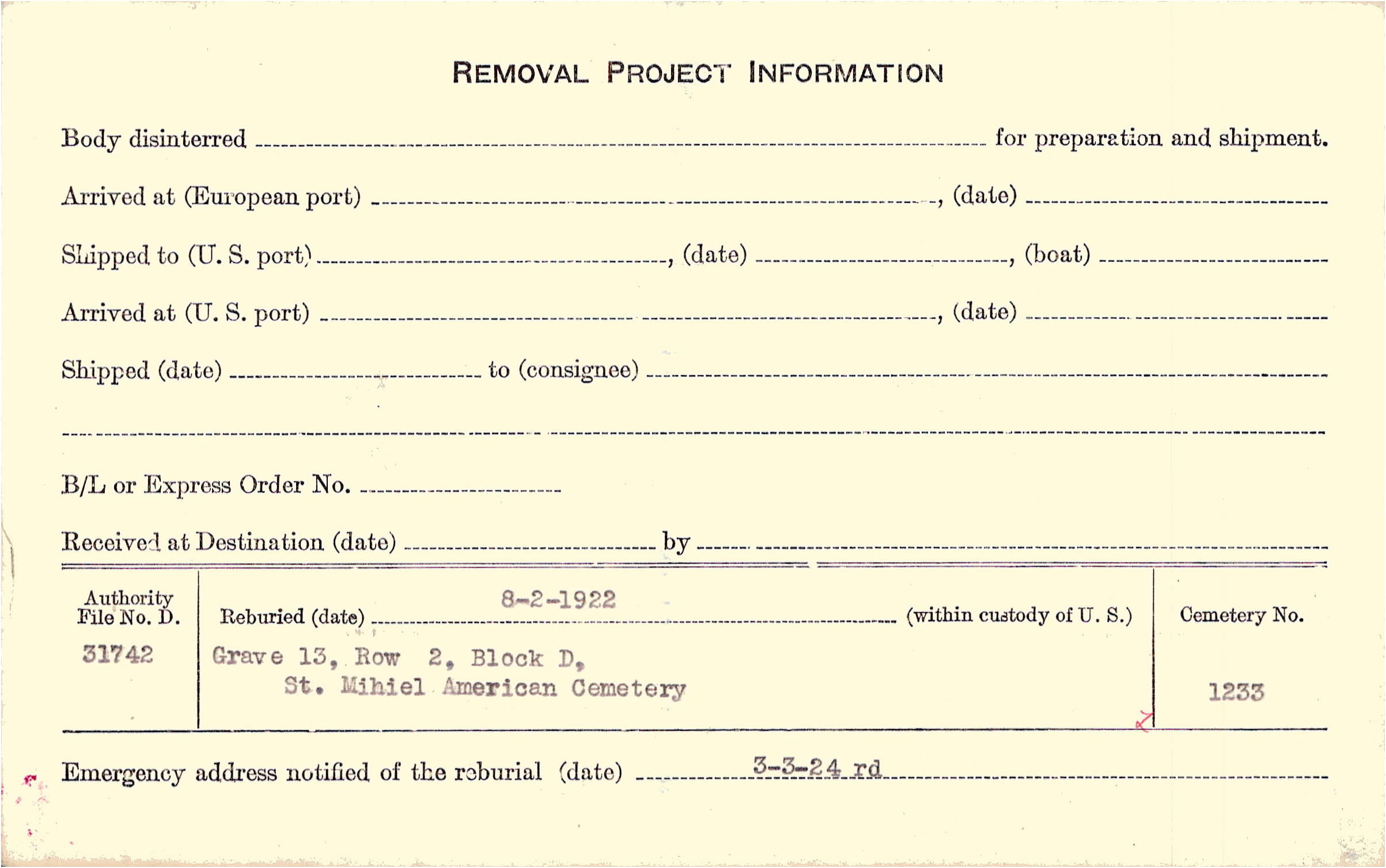 | Permanent Burial in Foreign Cemetery |