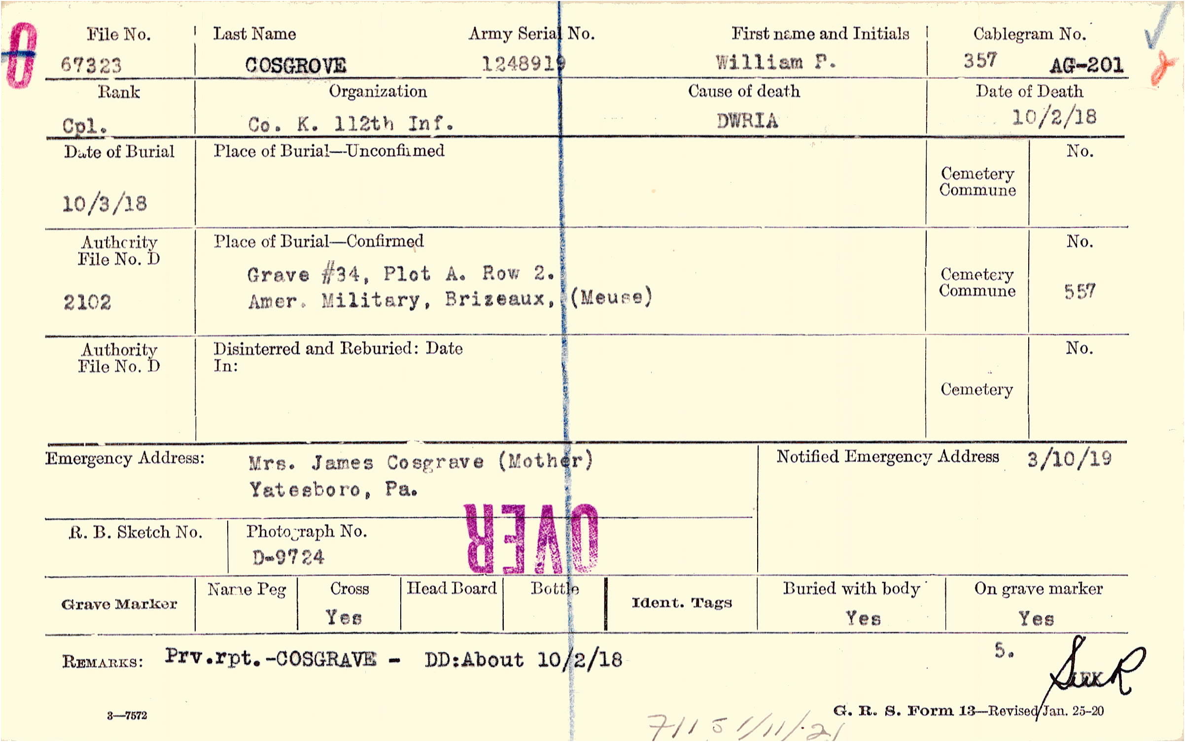 to Supt. National Cty., Gettysburg, Pa. Cemeterial records show Body shipped Aug. 12, 1921, to J. J. Cosgrove, Yatesboro, Pa.,