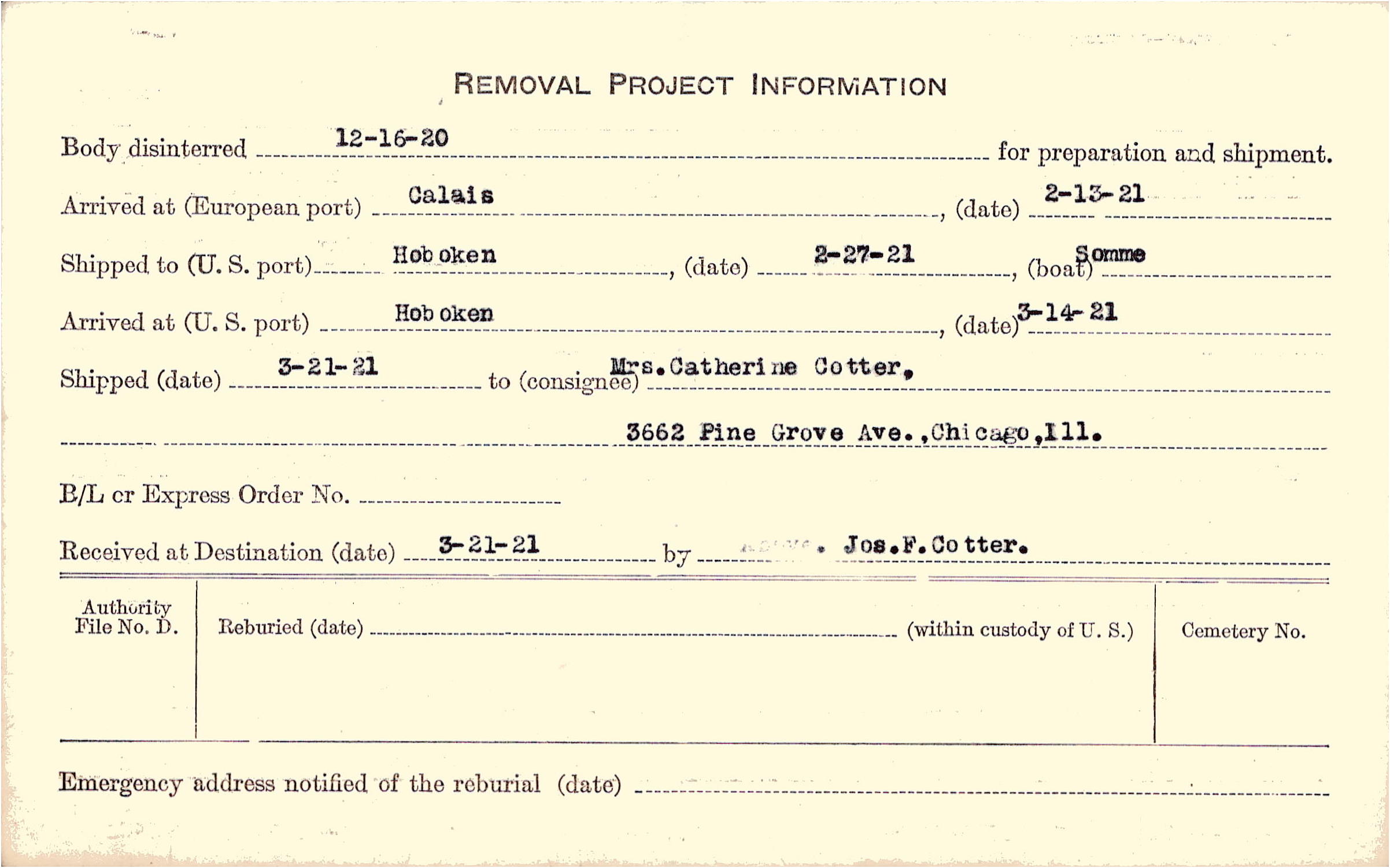Body disinterred 12/16/1920 for preparation and shipment.