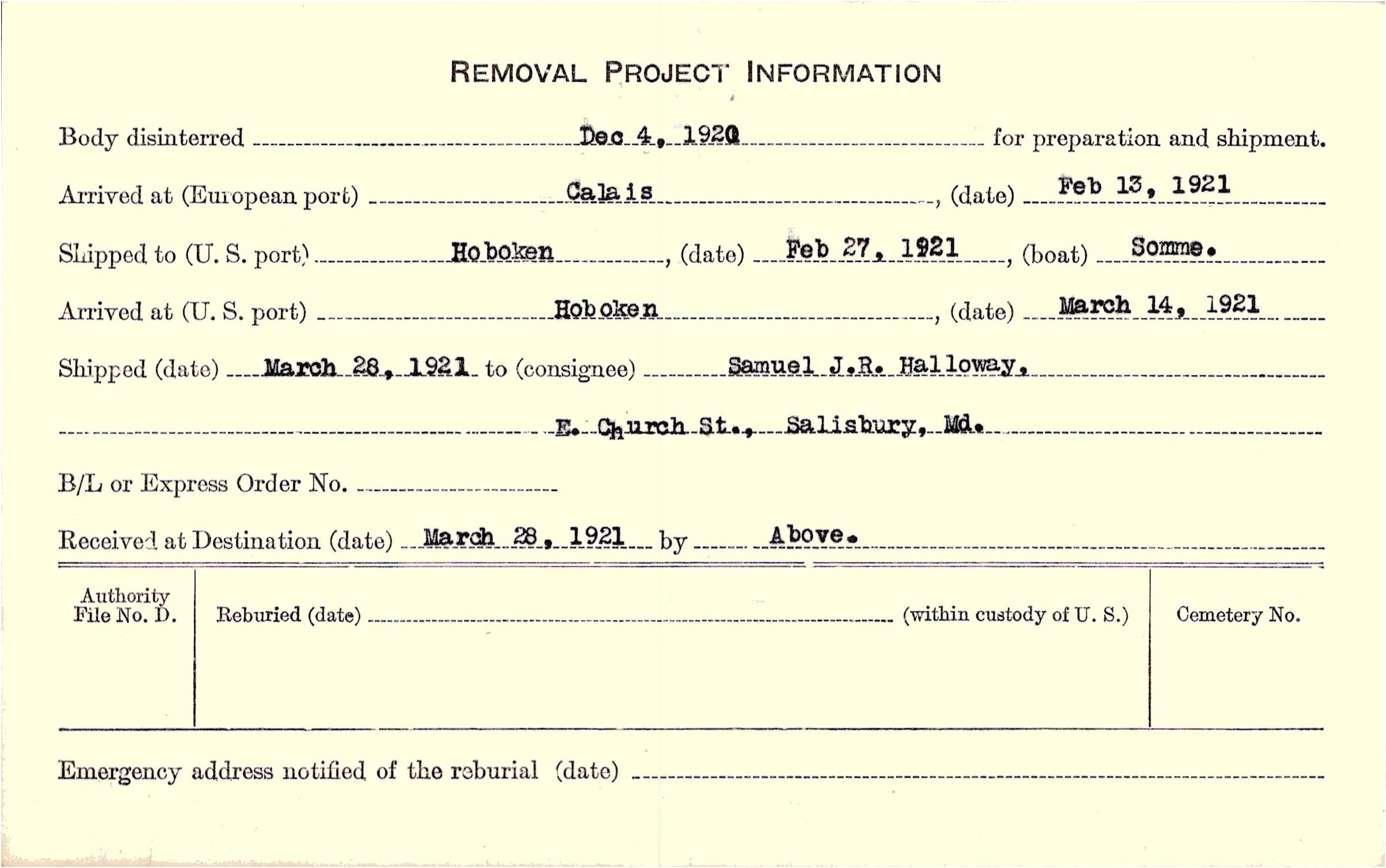 Body disinterred 12/4/1920 for preparation and shipment.
