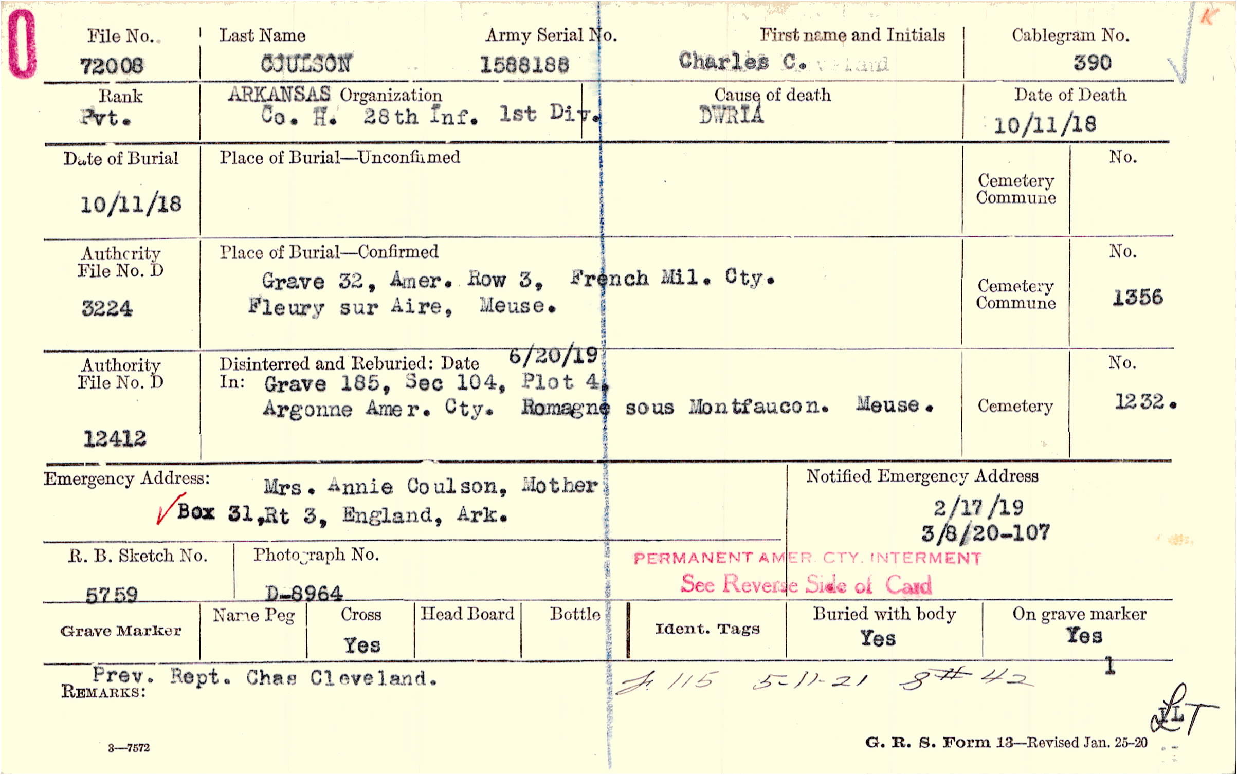 Mrs. Annie Coulson, Mother, Box 31,Rt 3, England, Ark.