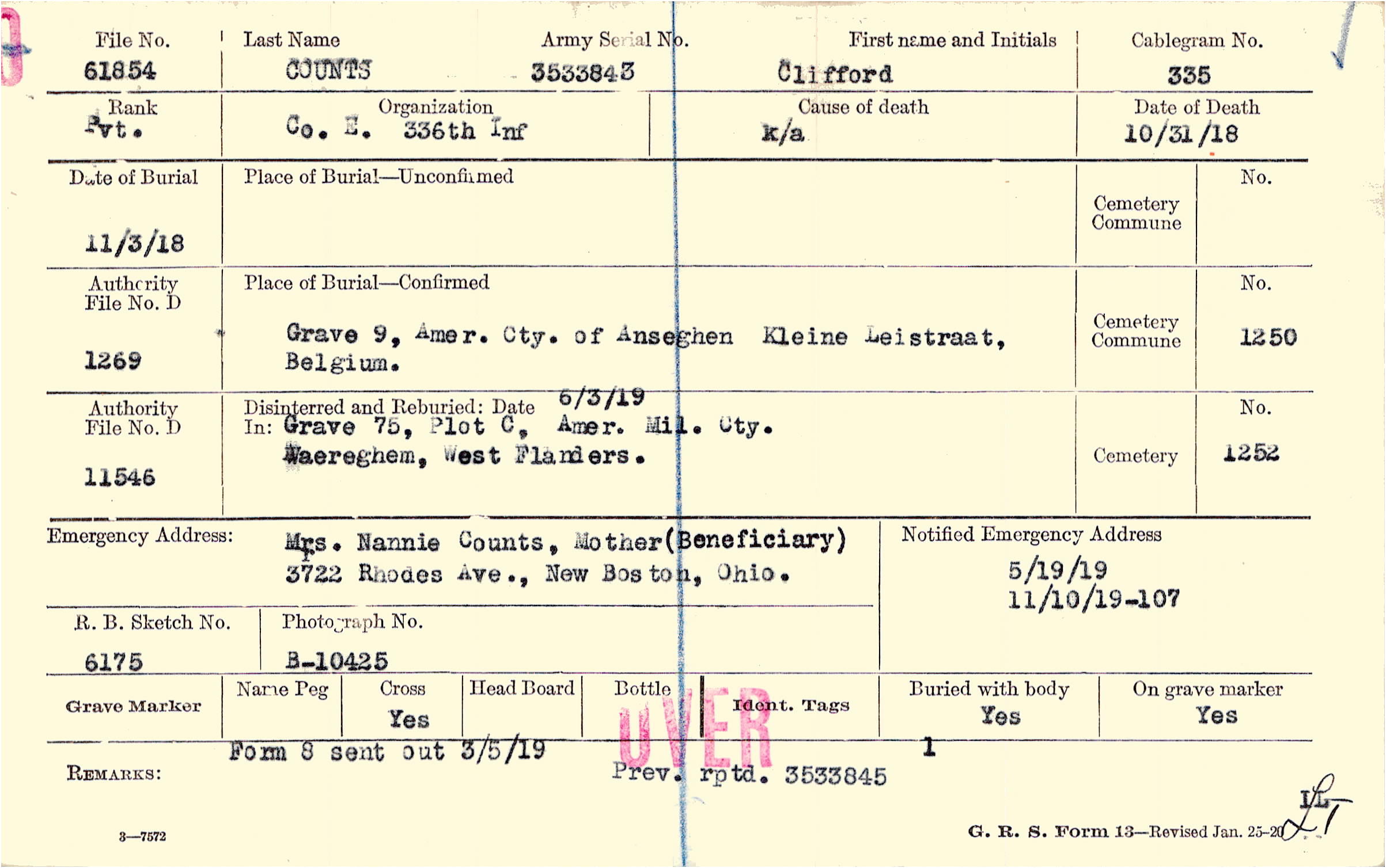 Mrs. Nannie Counts, Mother, 3722 Rhodes Ave., New Boston, Ohio., (Beneficiary)