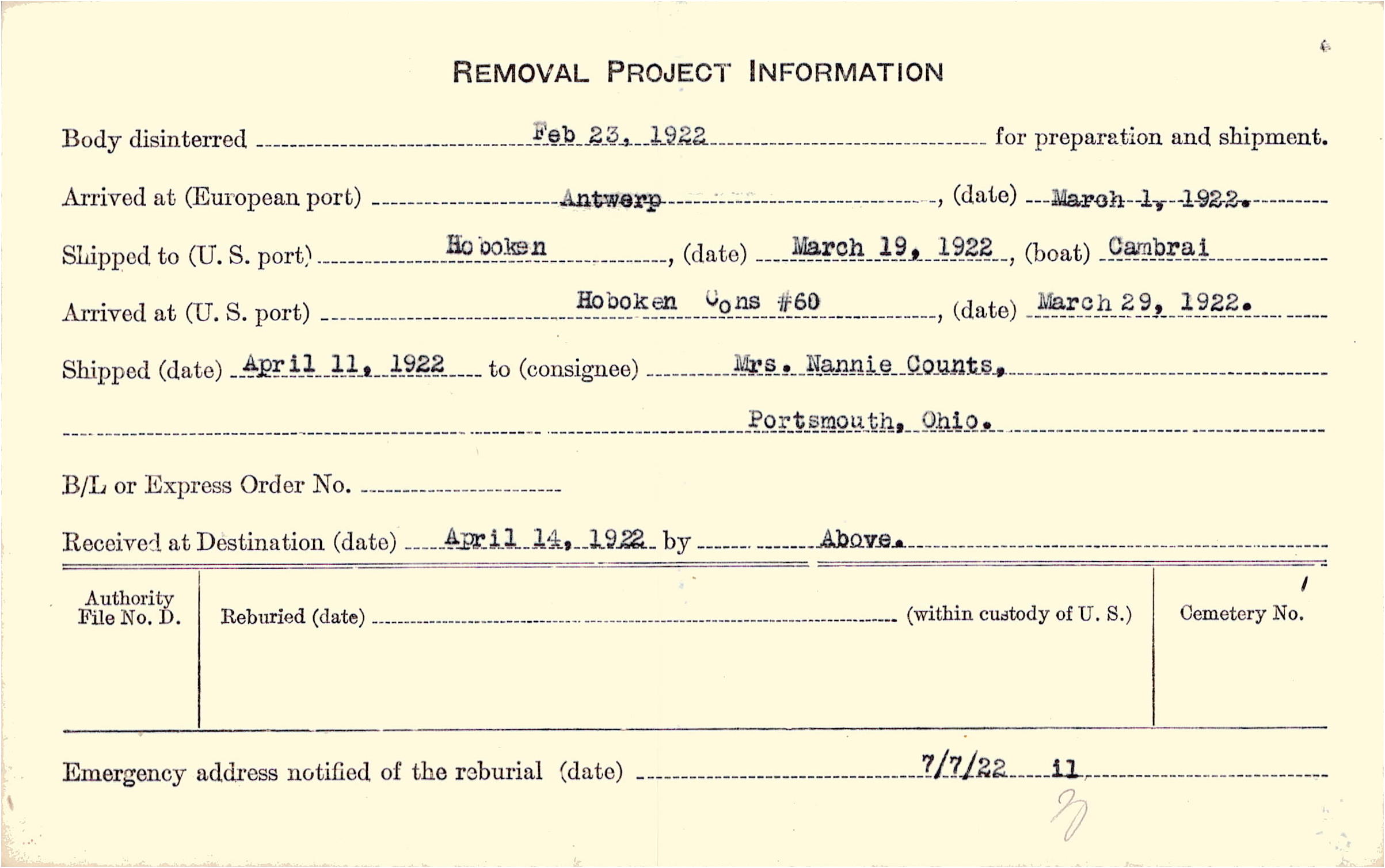 Body disinterred 2/23/1922 for preparation and shipment.