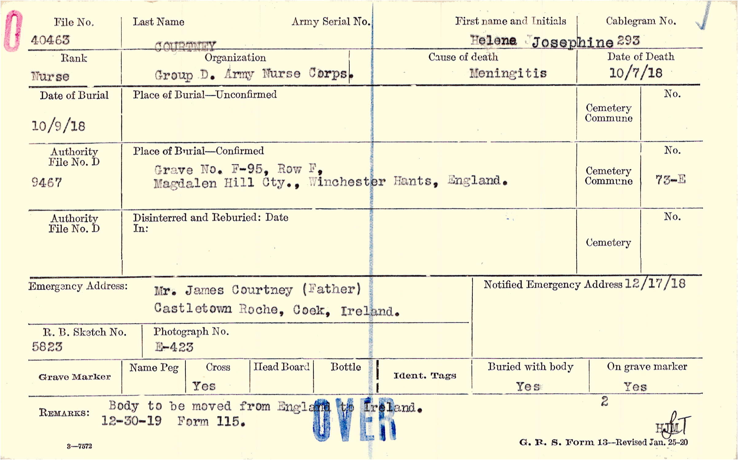 Grave F-95, Row F, Magdalen Hill Cty., Winchester, Hants, England.