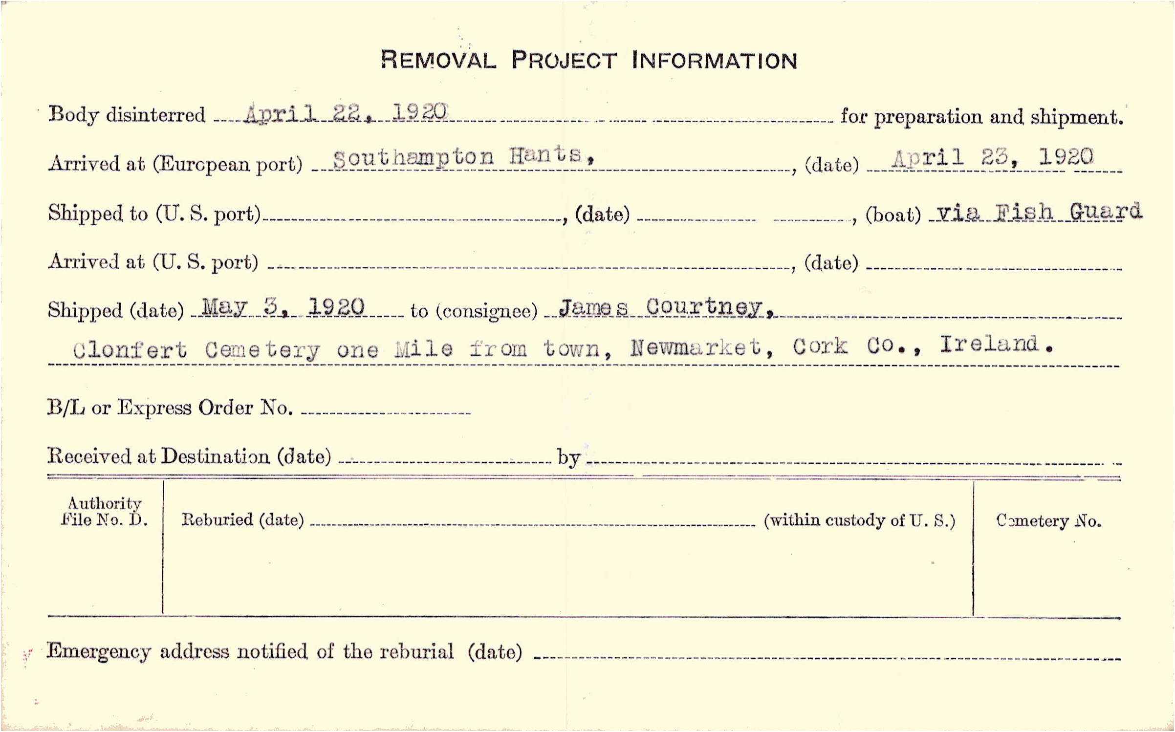 Body disinterred 4/22/1920 for preparation and shipment.