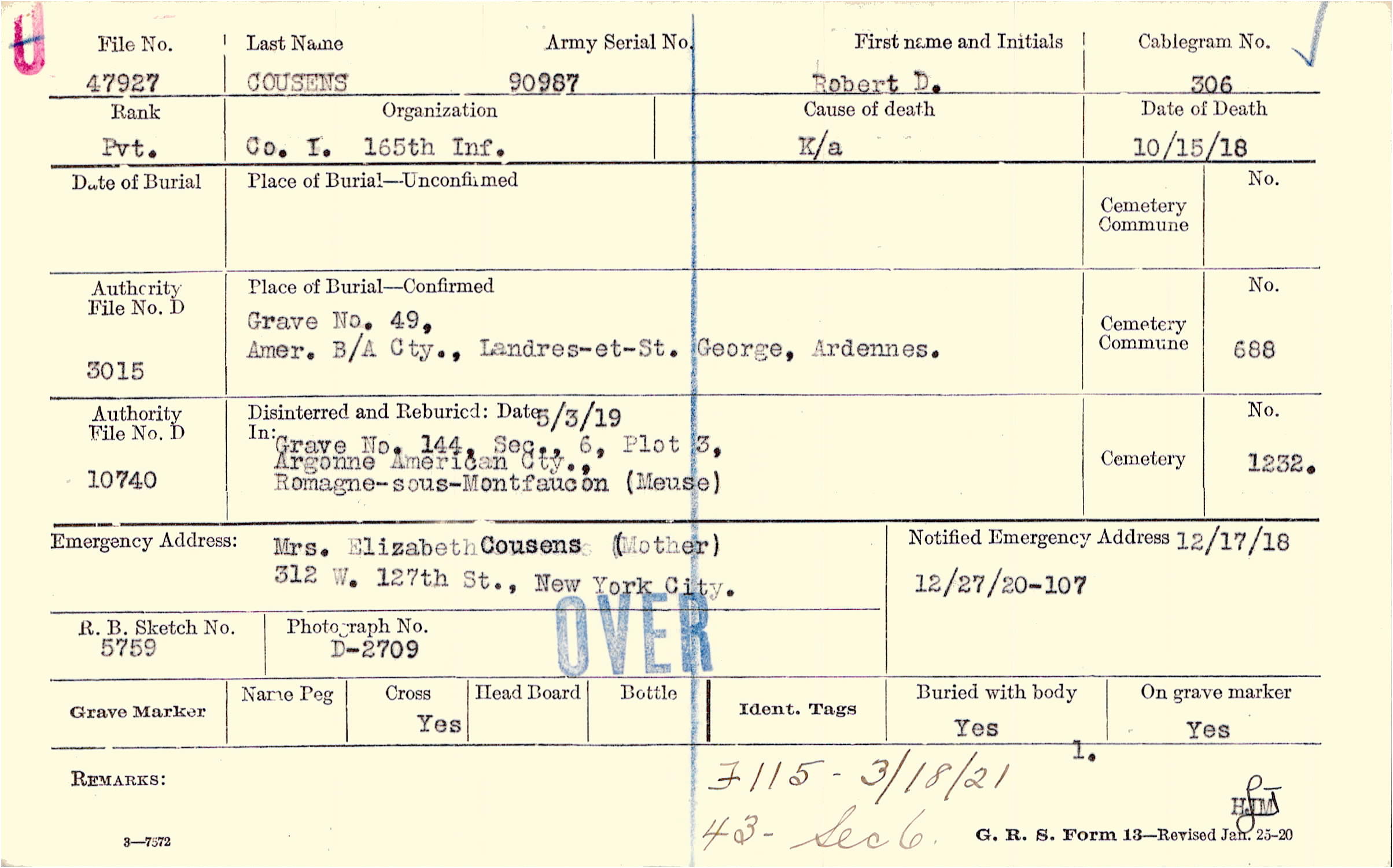 Mrs. Elizabeth Cousens (Mother), 312 W. 127th St., New York City.