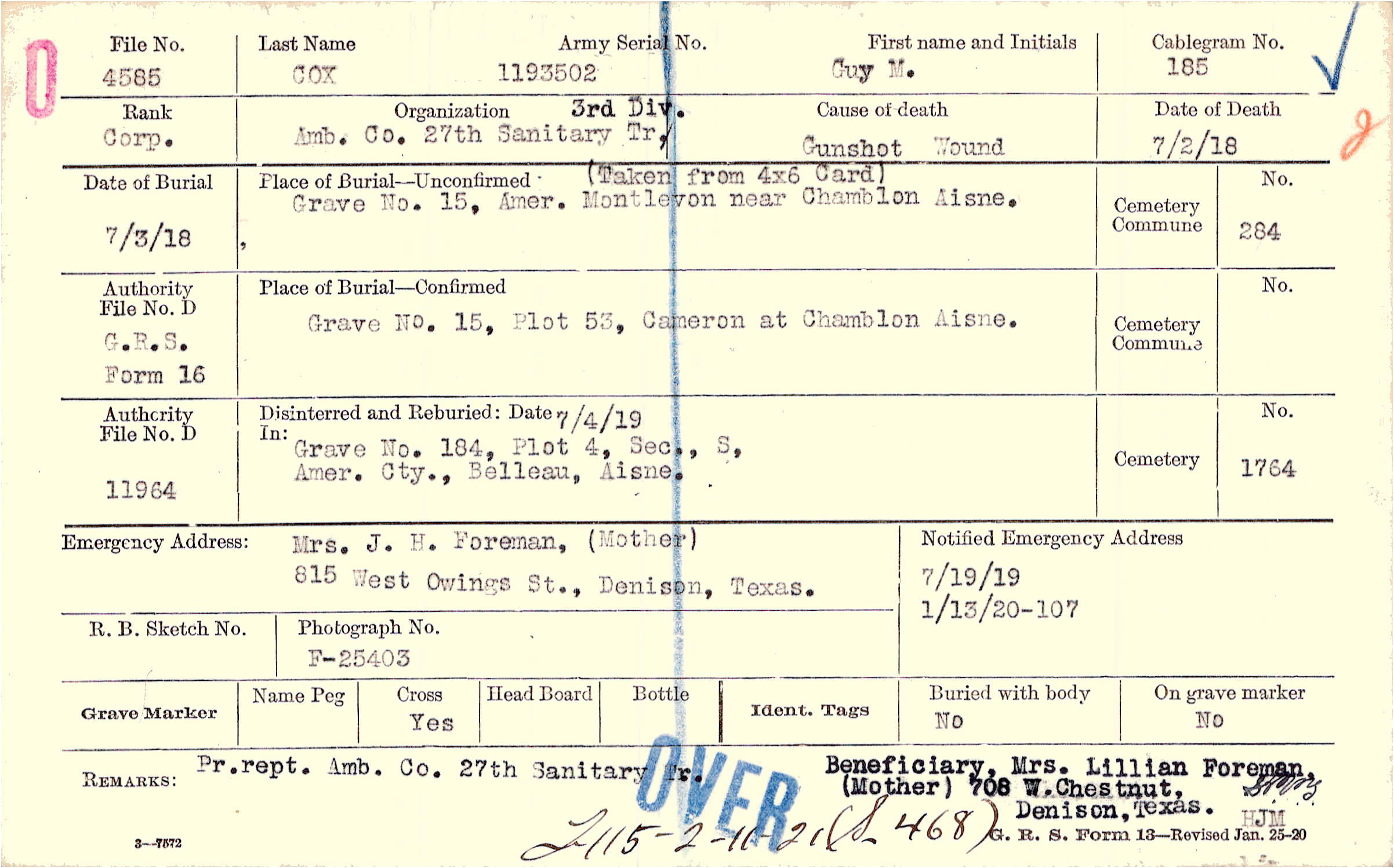 Pr. rept. Amb. Co. 27th Sanitary Tr. Beneficiary, Mrs. Lillian Foreman, (Mother) 708 W. Chestnut, Denison, Texas., F115-2-11-21 (S-468)