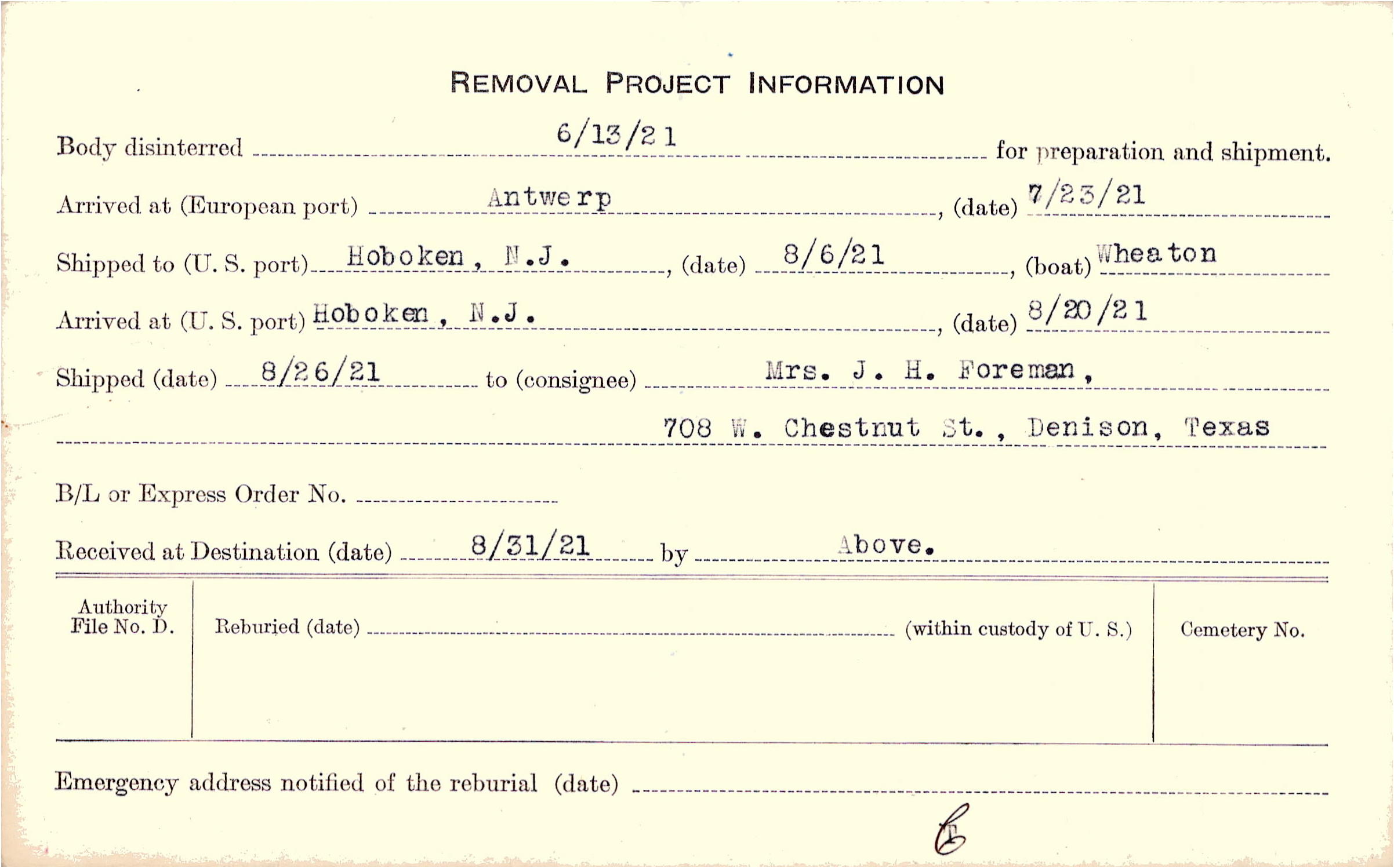 Body disinterred 6/13/1921 for preparation and shipment.