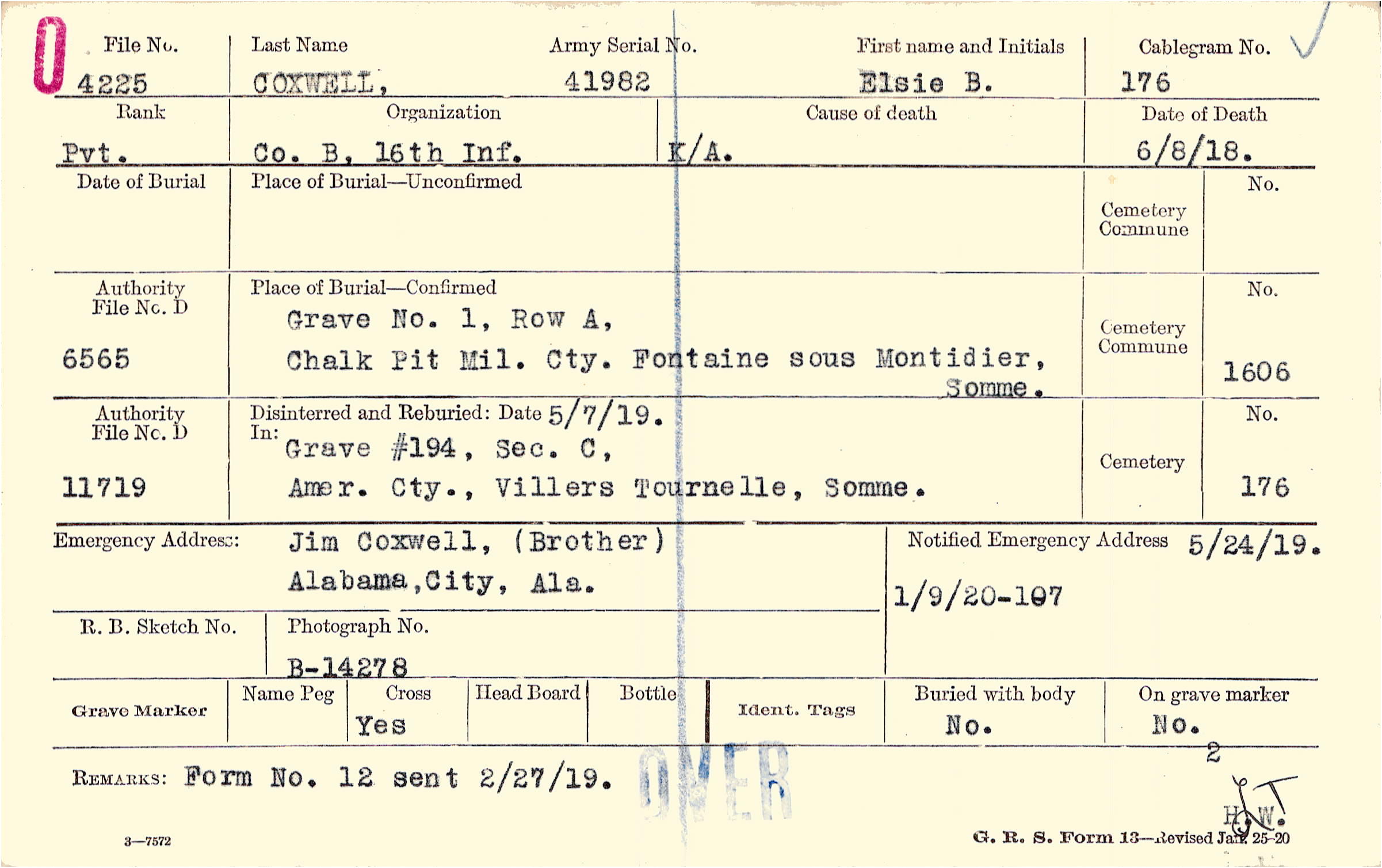 Grave 1, Row A,Chalk Pit Mil, Cty., Fontaine sous Montidier, Somme