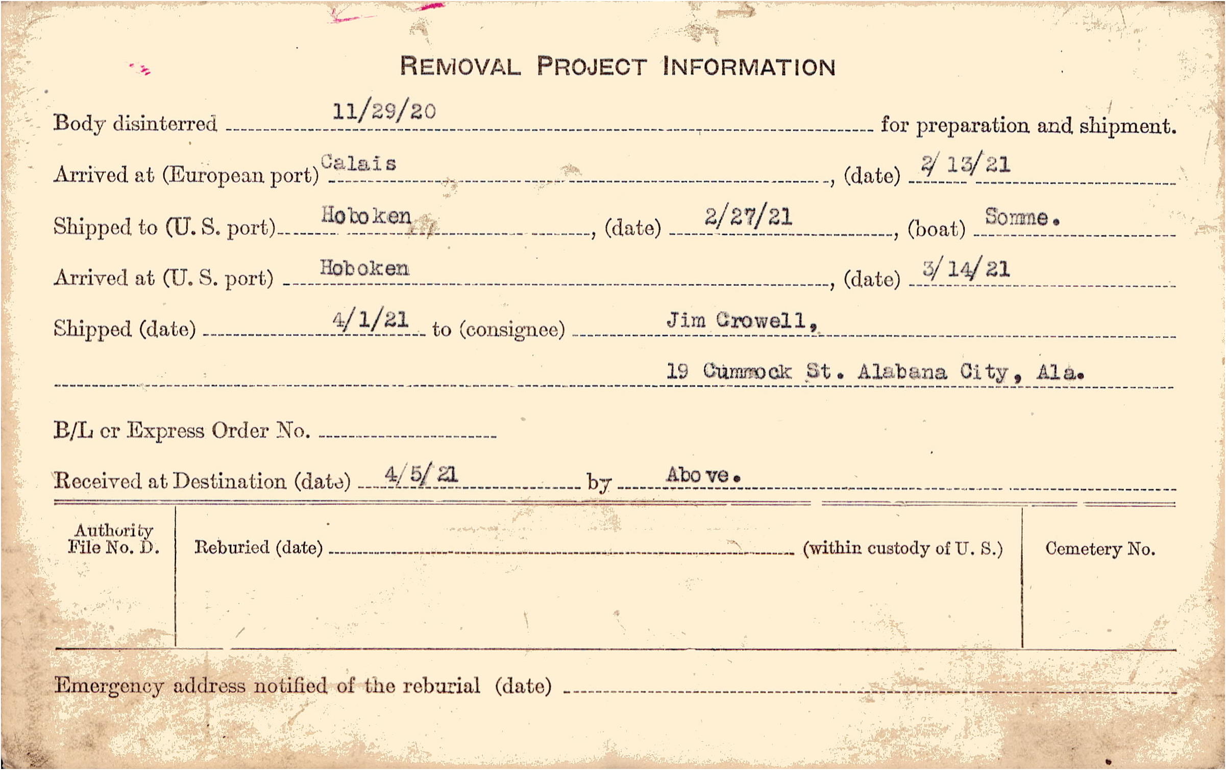 Body disinterred 11/29/1920 for preparation and shipment.