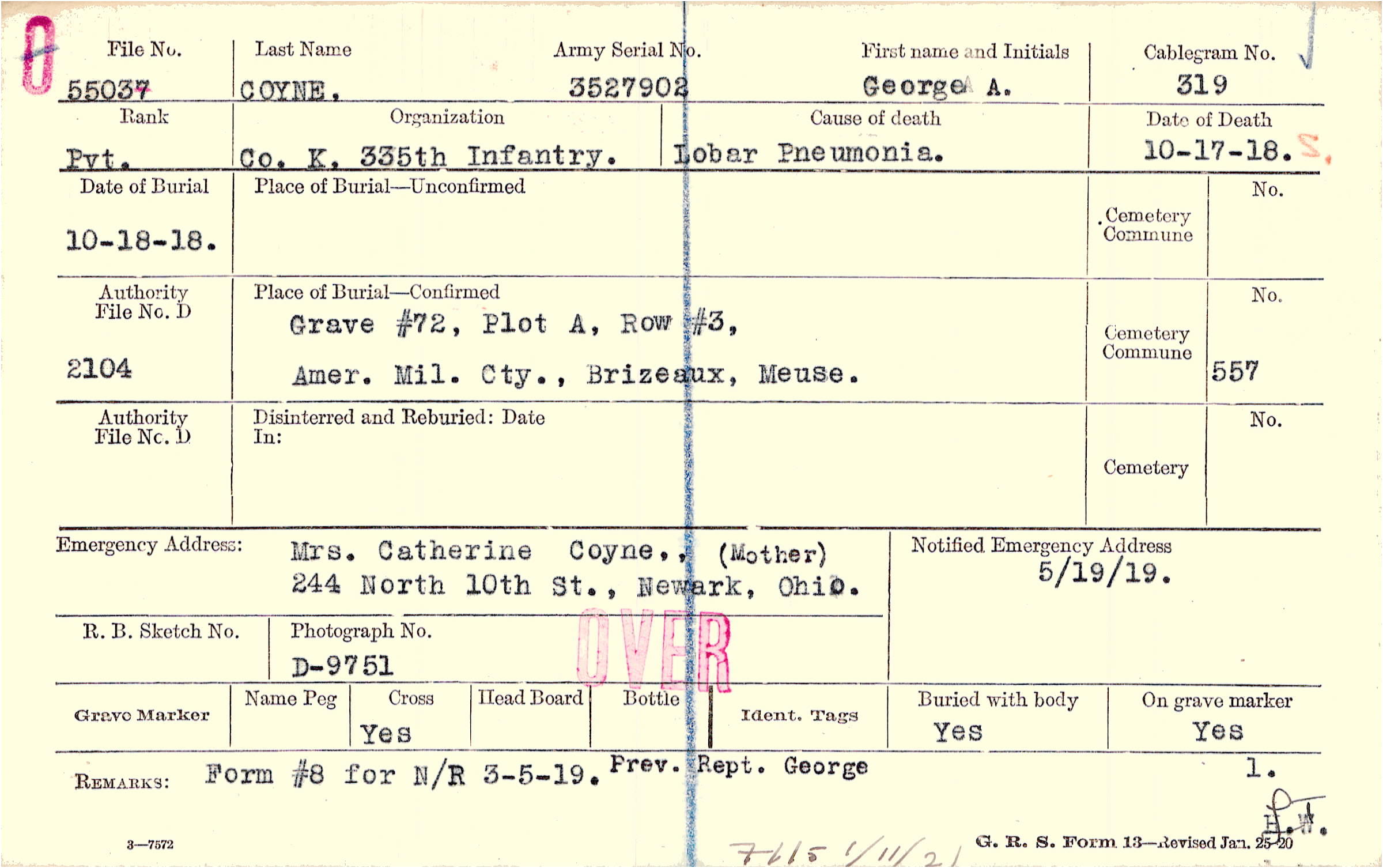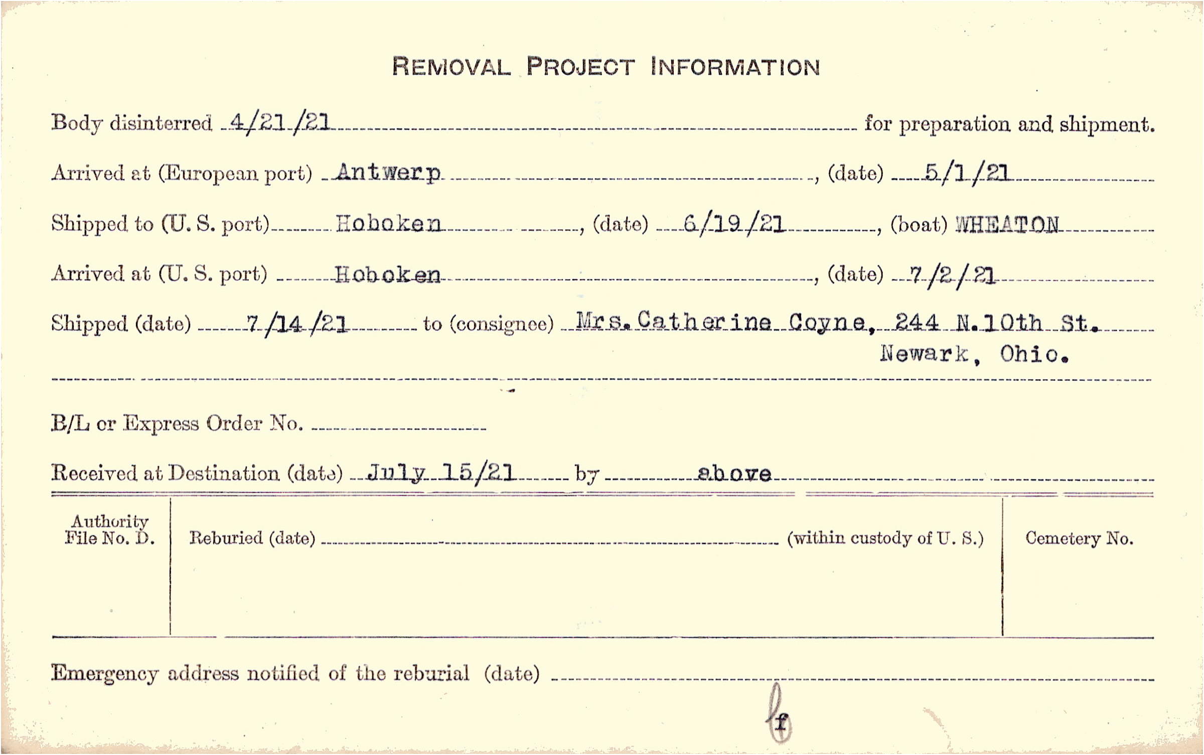 Mrs. Catherine Coyne, , (Mother), 244 North 10th St., Newark, Ohio
