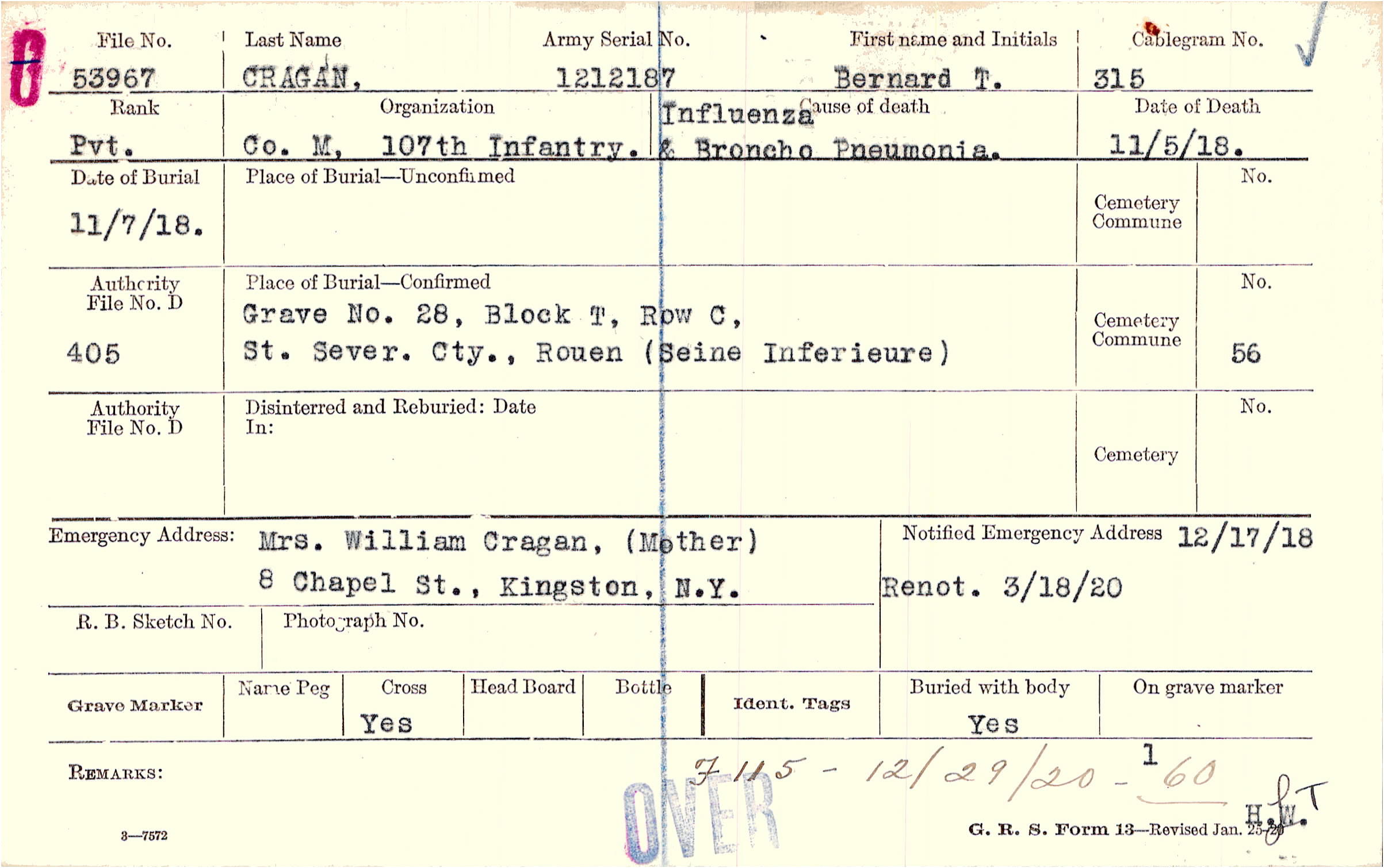 Mrs. William Cragan, (Mother), 8 Chapel St., Kingston, N.Y.