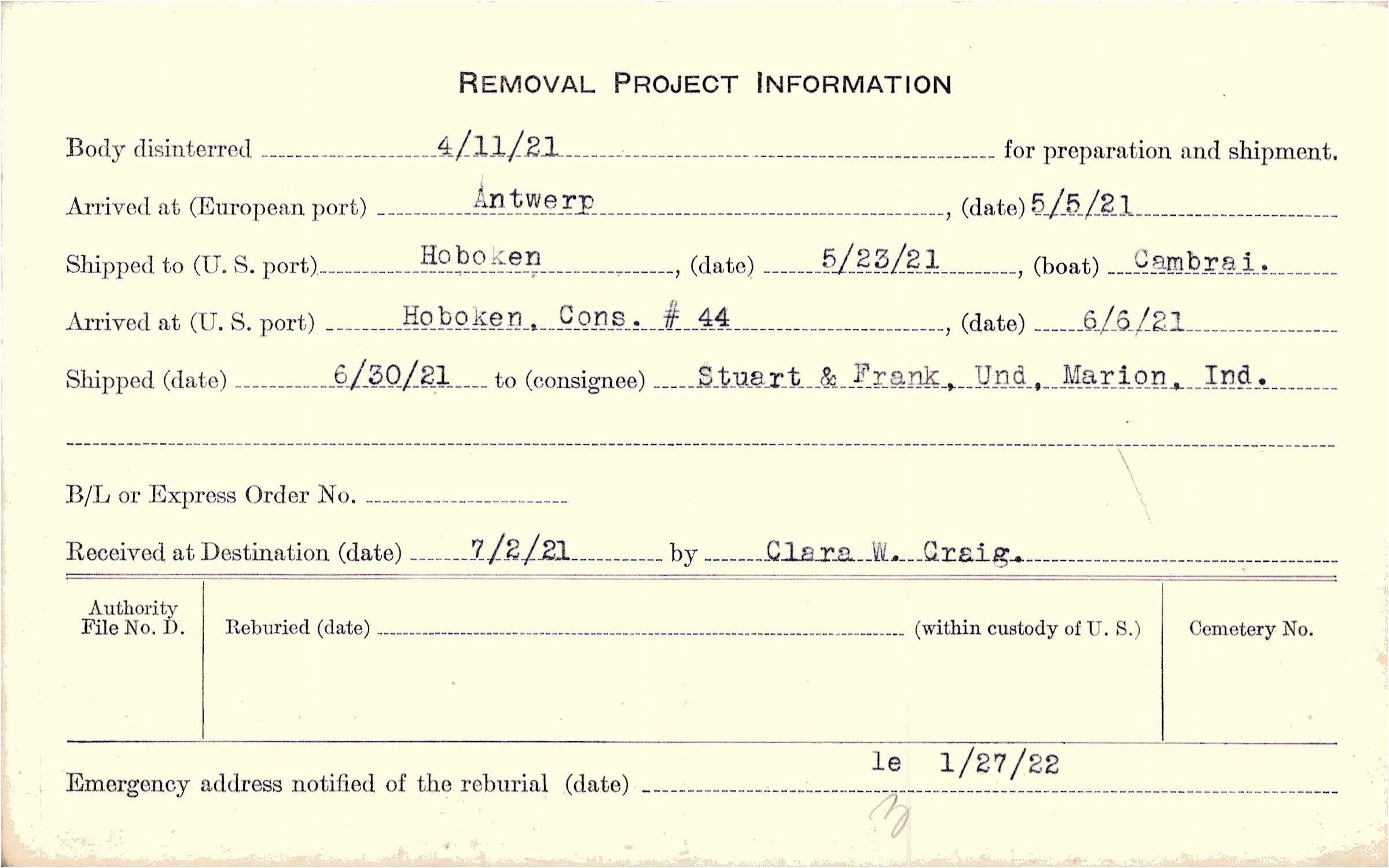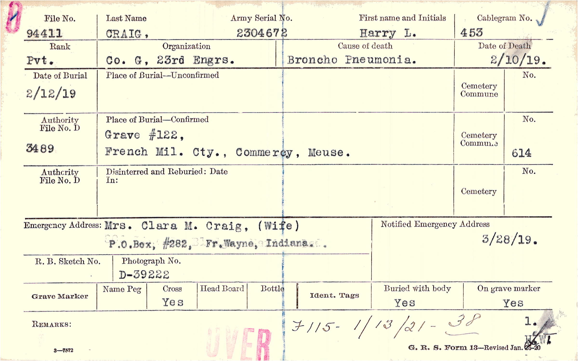 Mrs. Clara M. Craig, (Wife), P.O. Box, #282, Fr. Wayne, Indiana.