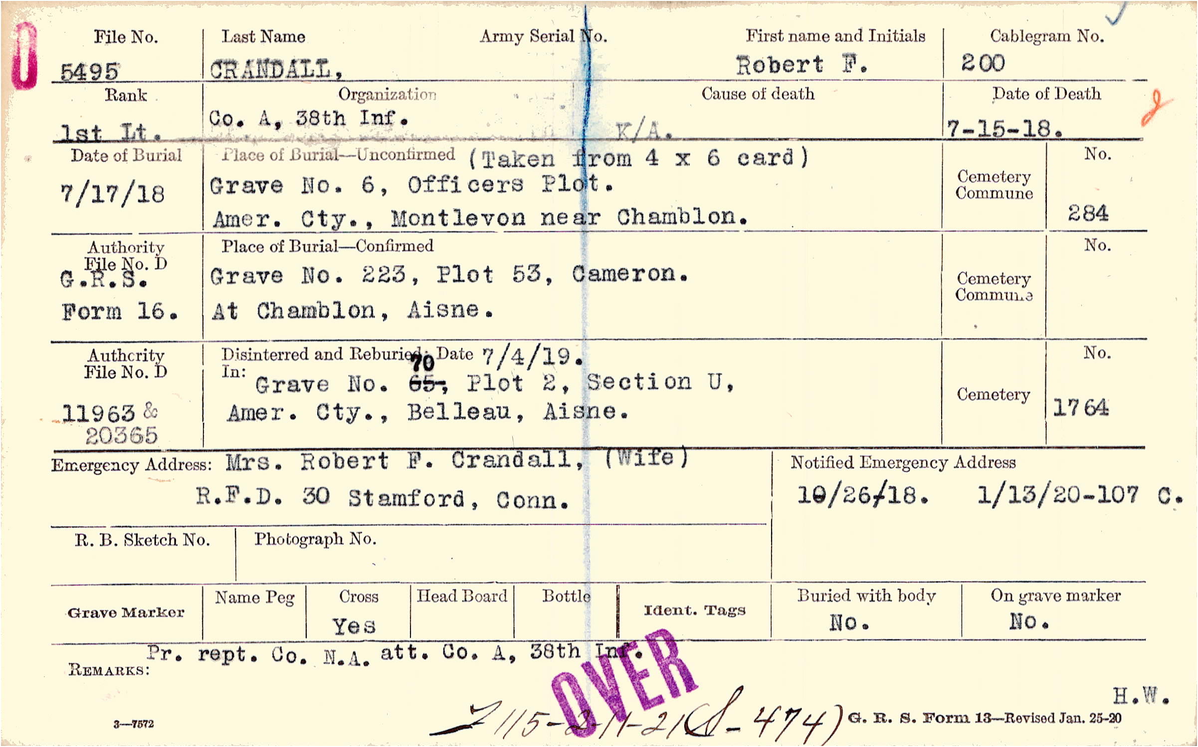 Mrs. Robert F. Crandall, (Wife), R.F.D. 30 Stamford, Conn., Pr. rept. Co. N.A. att. Co. A. 38th Inf.