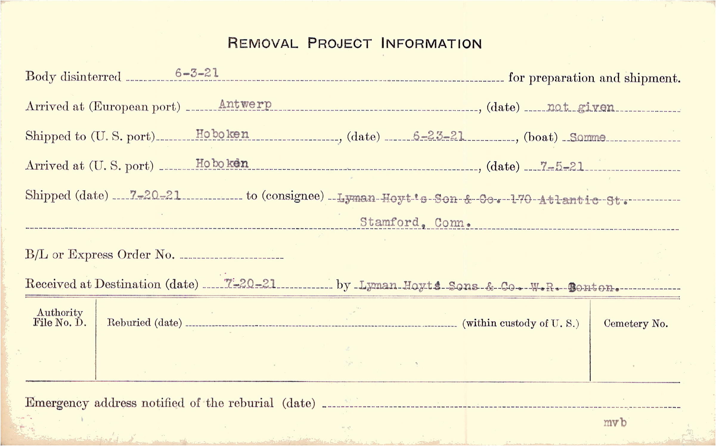 Body disinterred 6/3/1921 for preparation and shipment.
