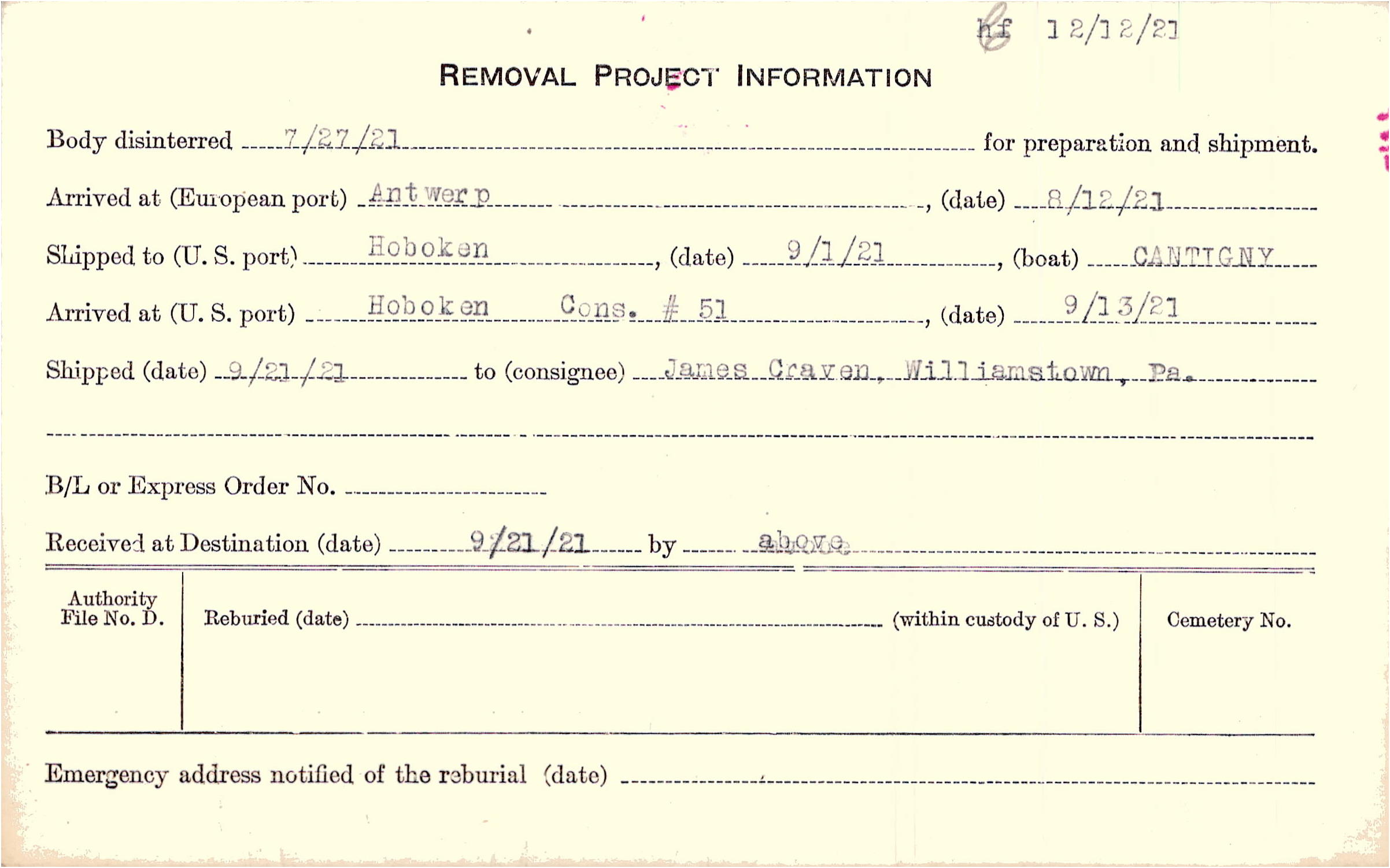 Body disinterred 7/27/1921 for preparation and shipment.