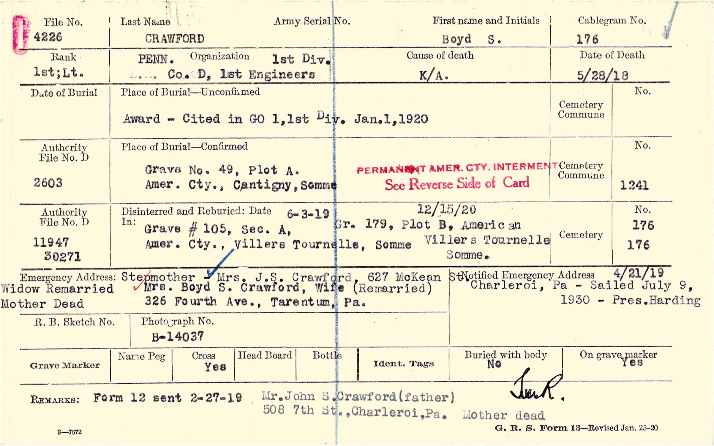 Mr. John S. Crawford, father, 508 7th St., Charlerci, Pa. Mother dead, Form 12 sent 2-27-19