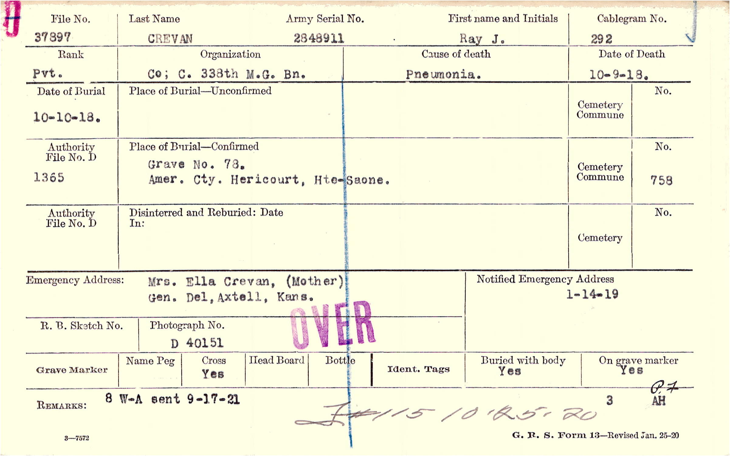 Mrs. Ella Crevan, (Mother), Gen. Del, Axtell, Kans.