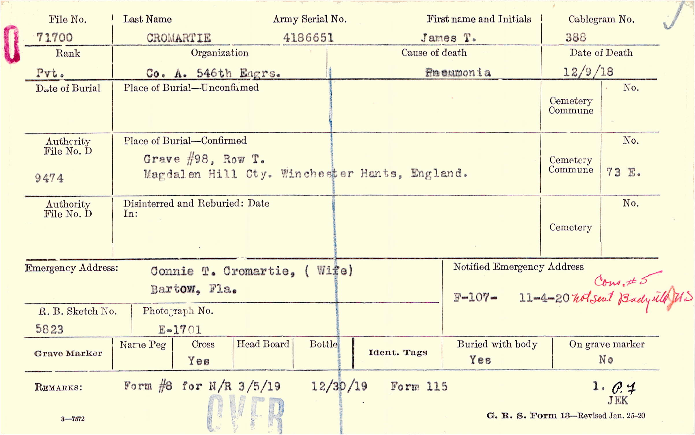 Form 107: 11/4/1920, Cons #5, not sent Bady? U S