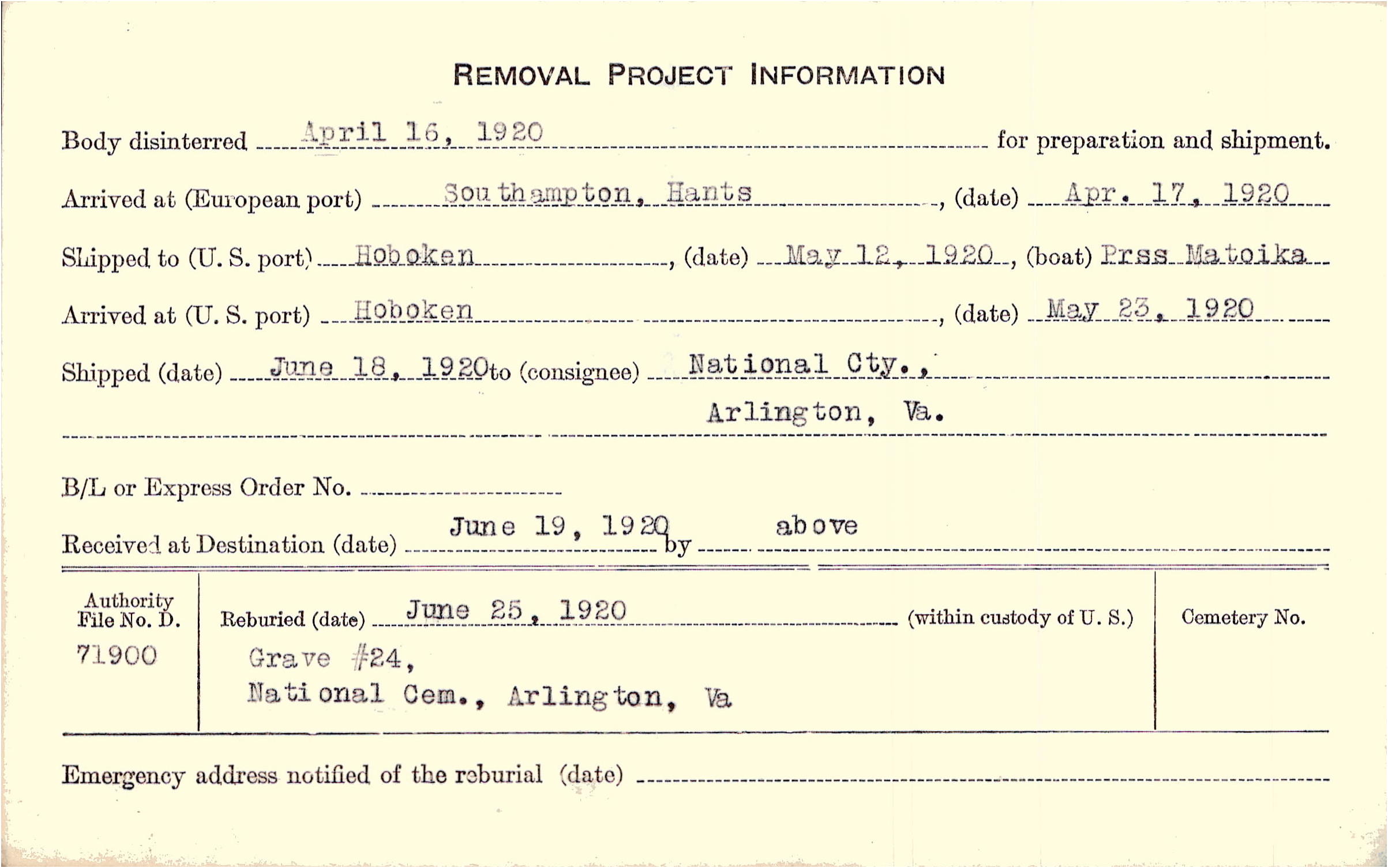 Body disinterred 4/16/1920 for preparation and shipment.