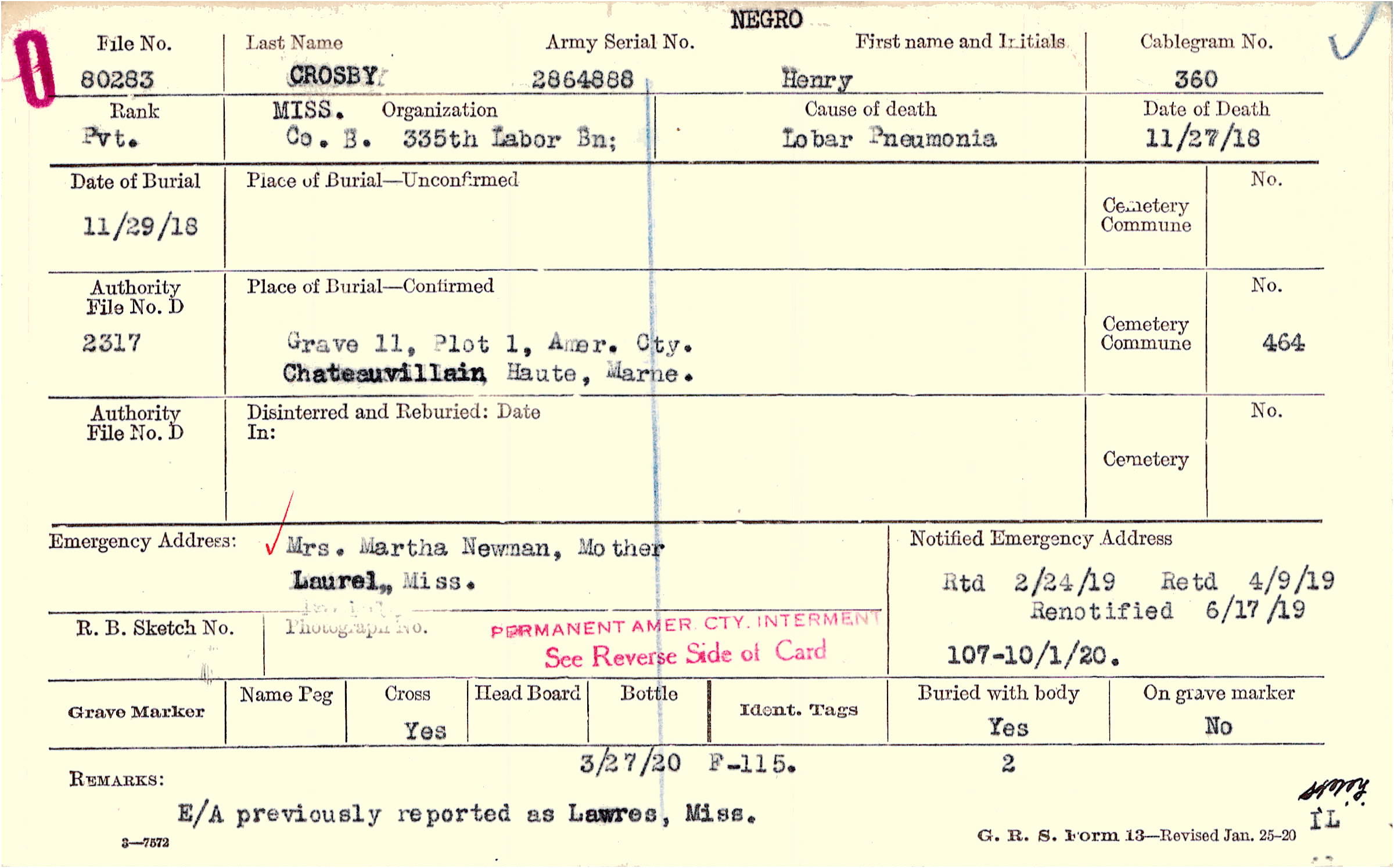 Grave 11, Plot 1, Amer. Cty., Chateauvillain, Haute, Marne.