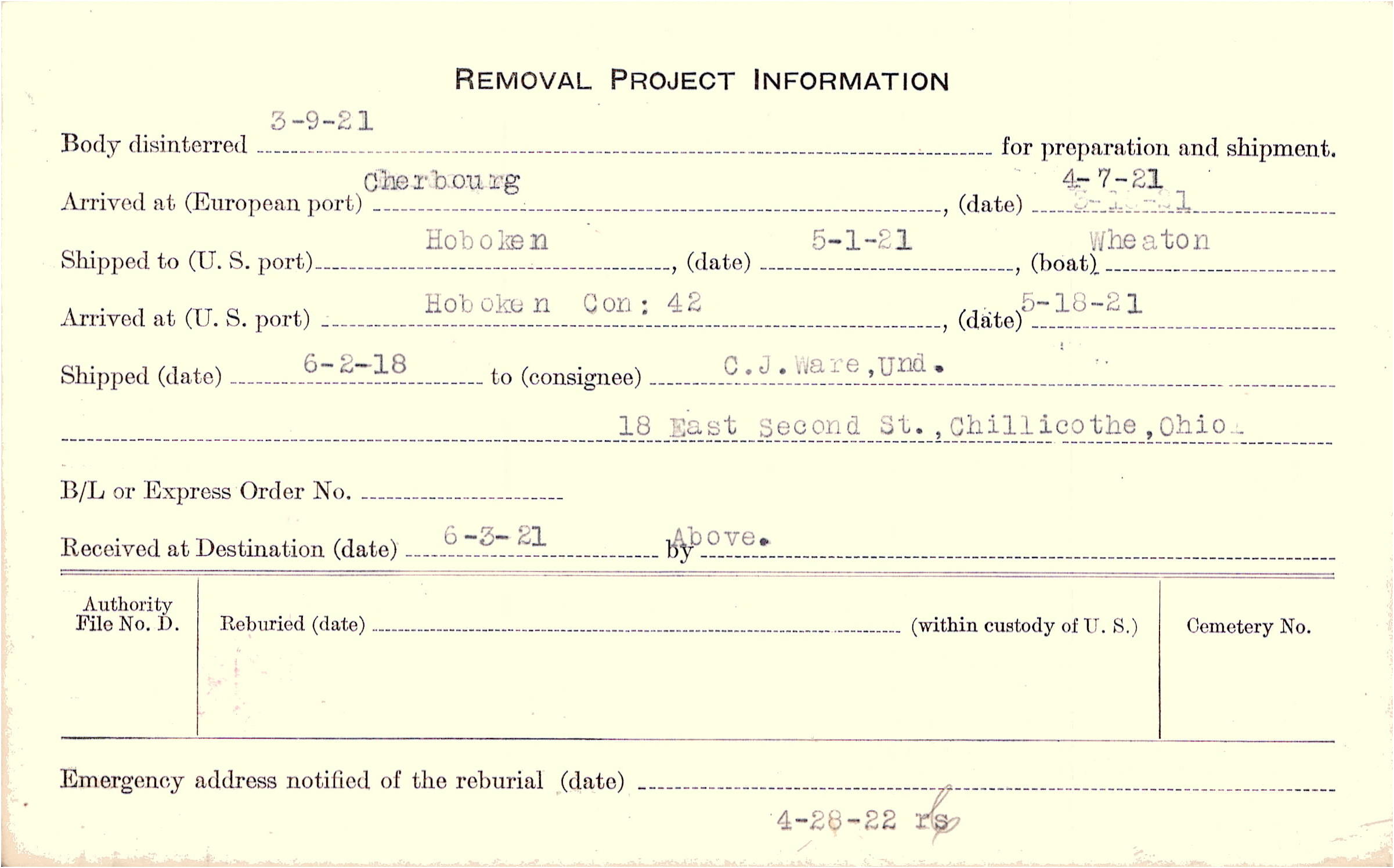 Body disinterred 3/9/1921 for preparation and shipment.