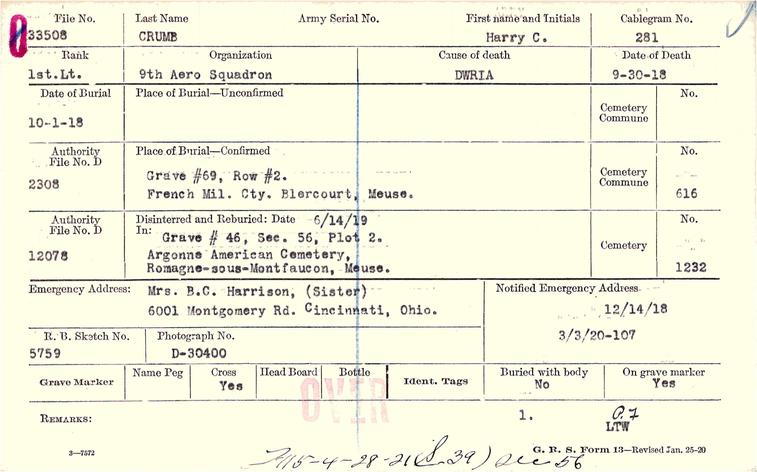 Mrs. B.C. Harrison, (Sister), 6001 Montgomery Rd. Cincinnati, Ohio.
