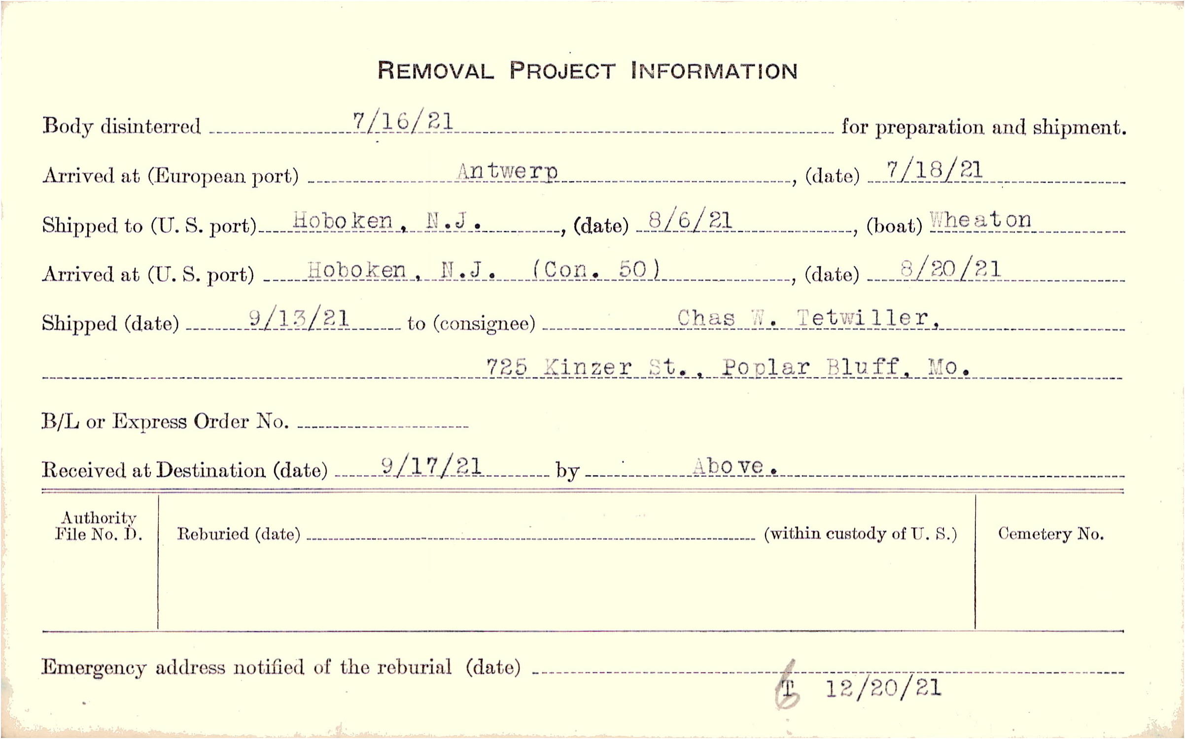 Body disinterred 7/16/1921 for preparation and shipment.