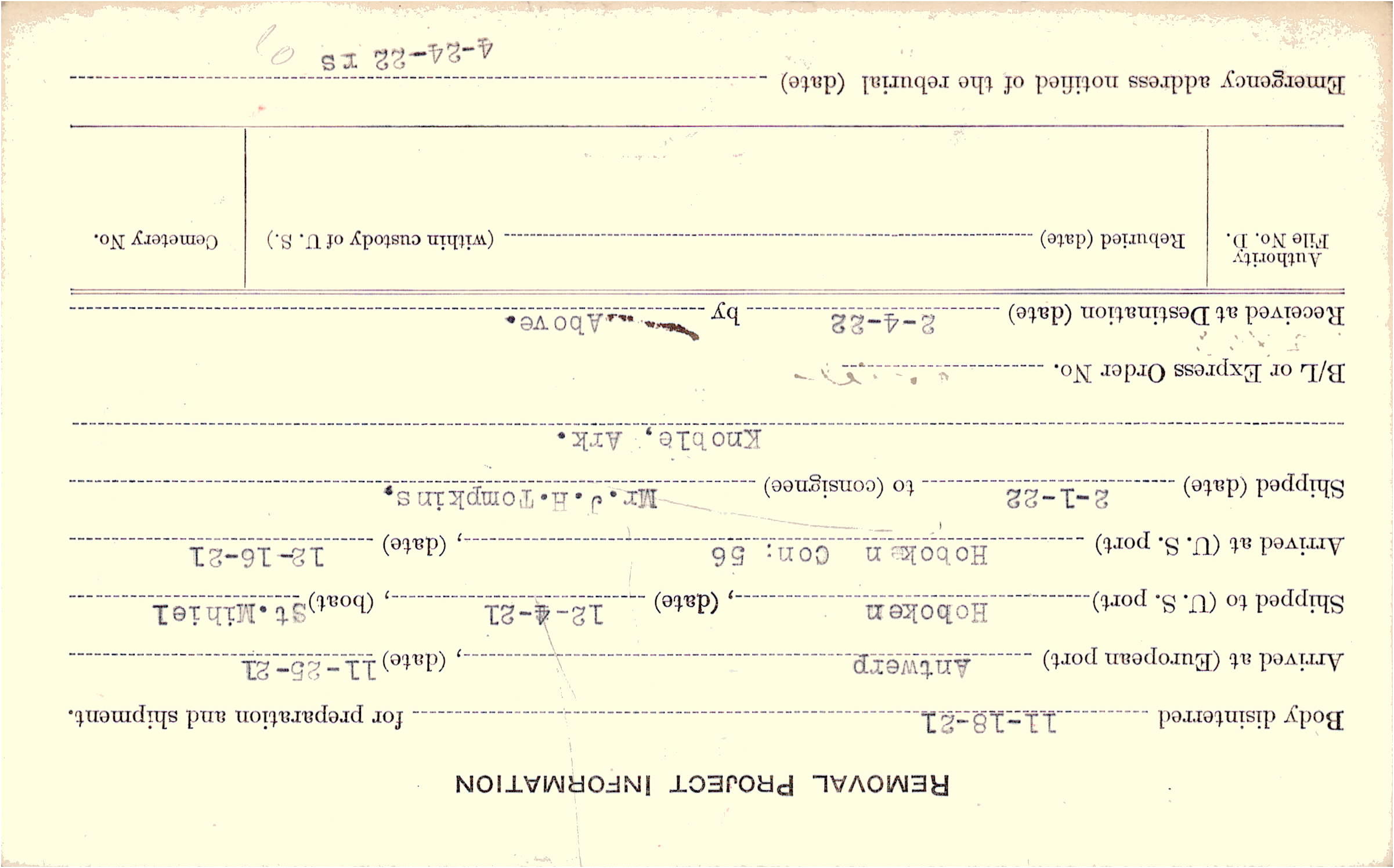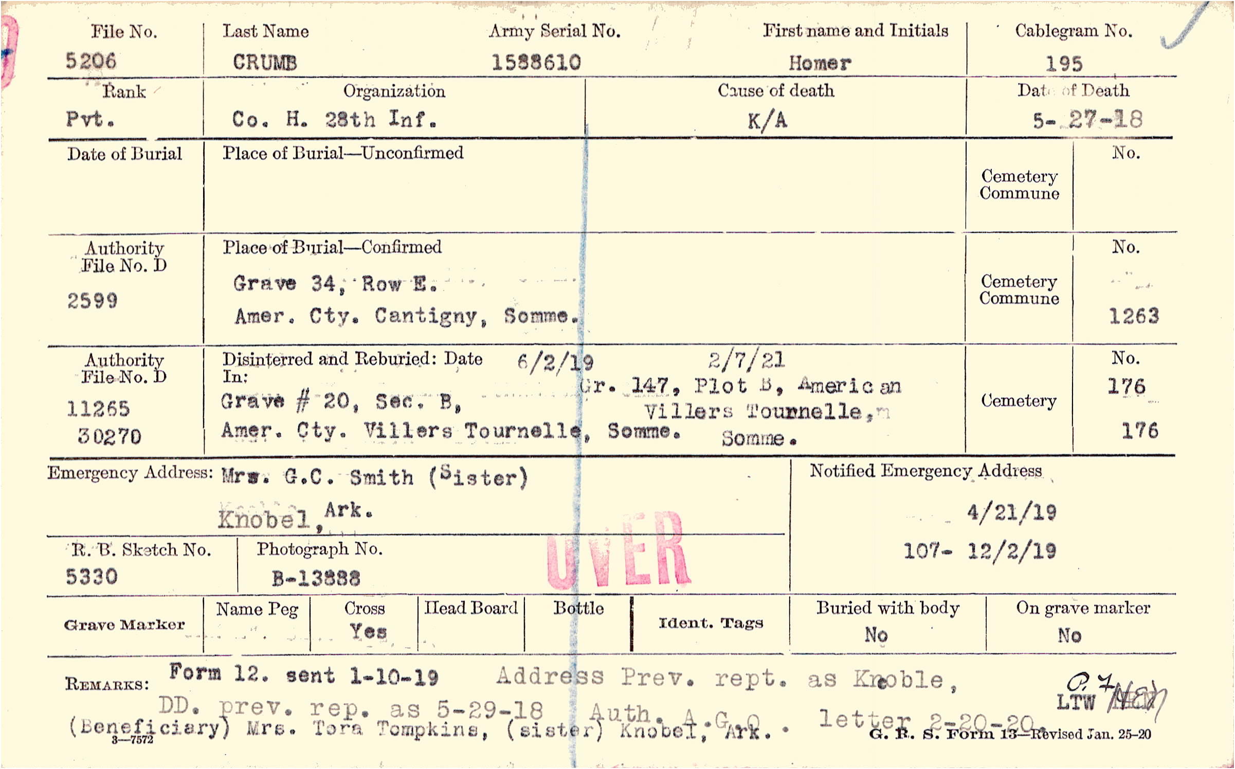 Address Prev. rept. as Knoble, DD. prev. rep. as 5-29-18 Auth. A.G.O. letter 2-20-20. (Beneficiary) Mrs. Tora Tomkins, (sister) Knobel, Ark., Form 12. sent 1-10-10