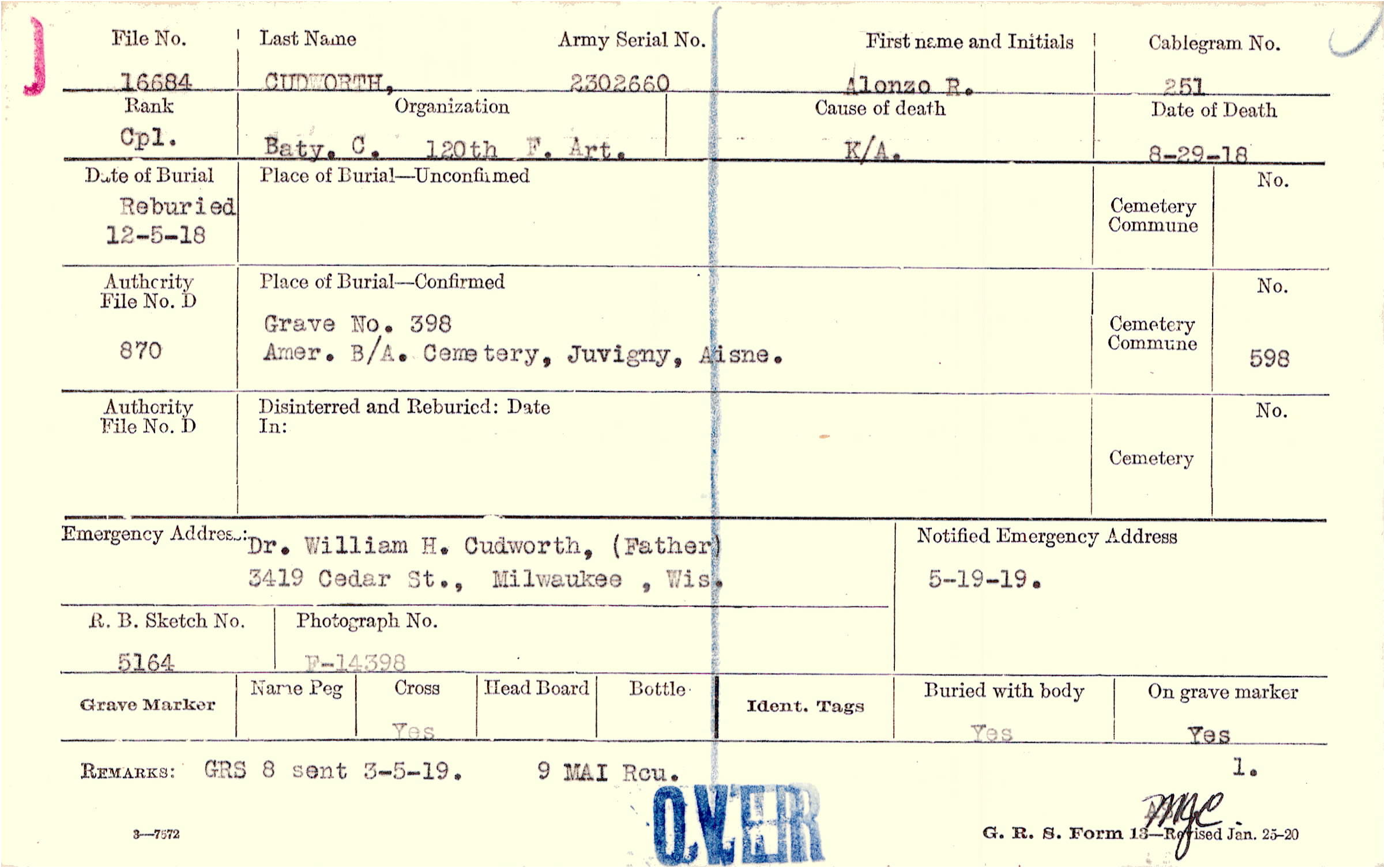 Grave 398, Amer. B/A. Cemetery, Juvigny, Aisne.
