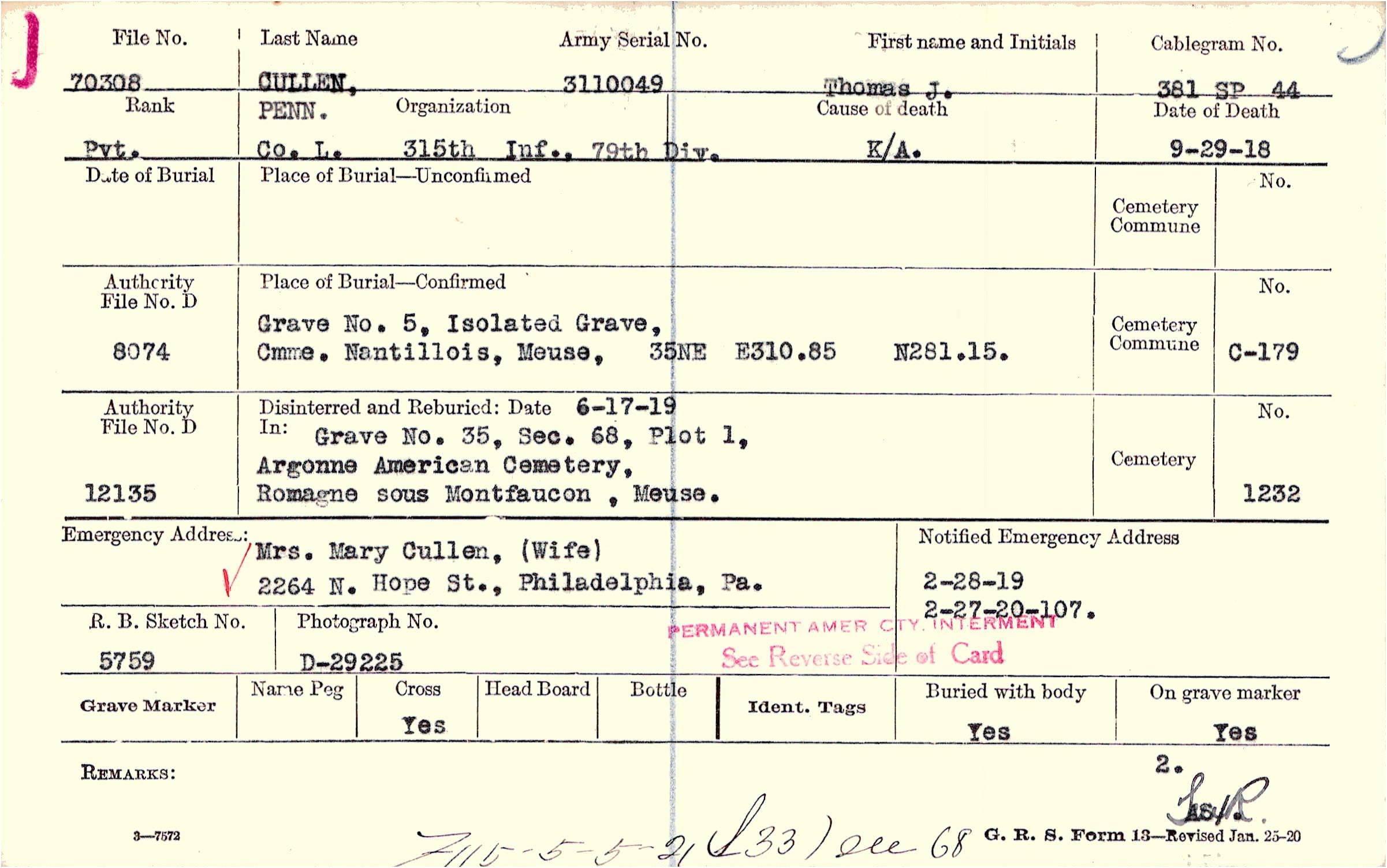 Mrs. Mary Cullen, (Wife), 2264 N. Hope St., Philadelphia, Pa., PERMANENT AMER CTY. INTERNMENT See Reverse Side of Card