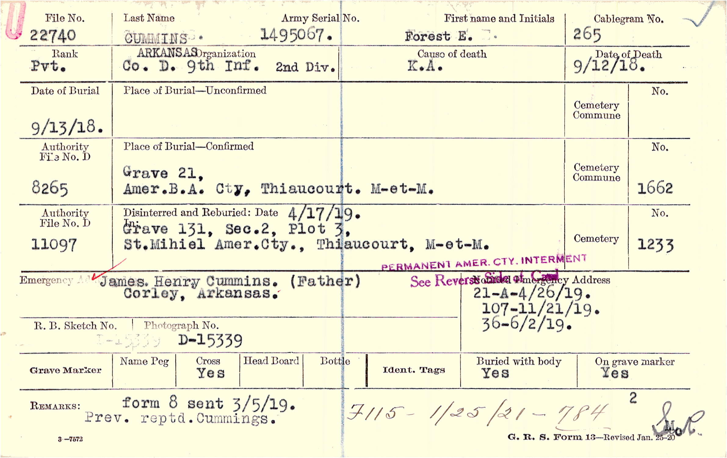 James. Henry Cummins. (Father), Corley, Arkansas.