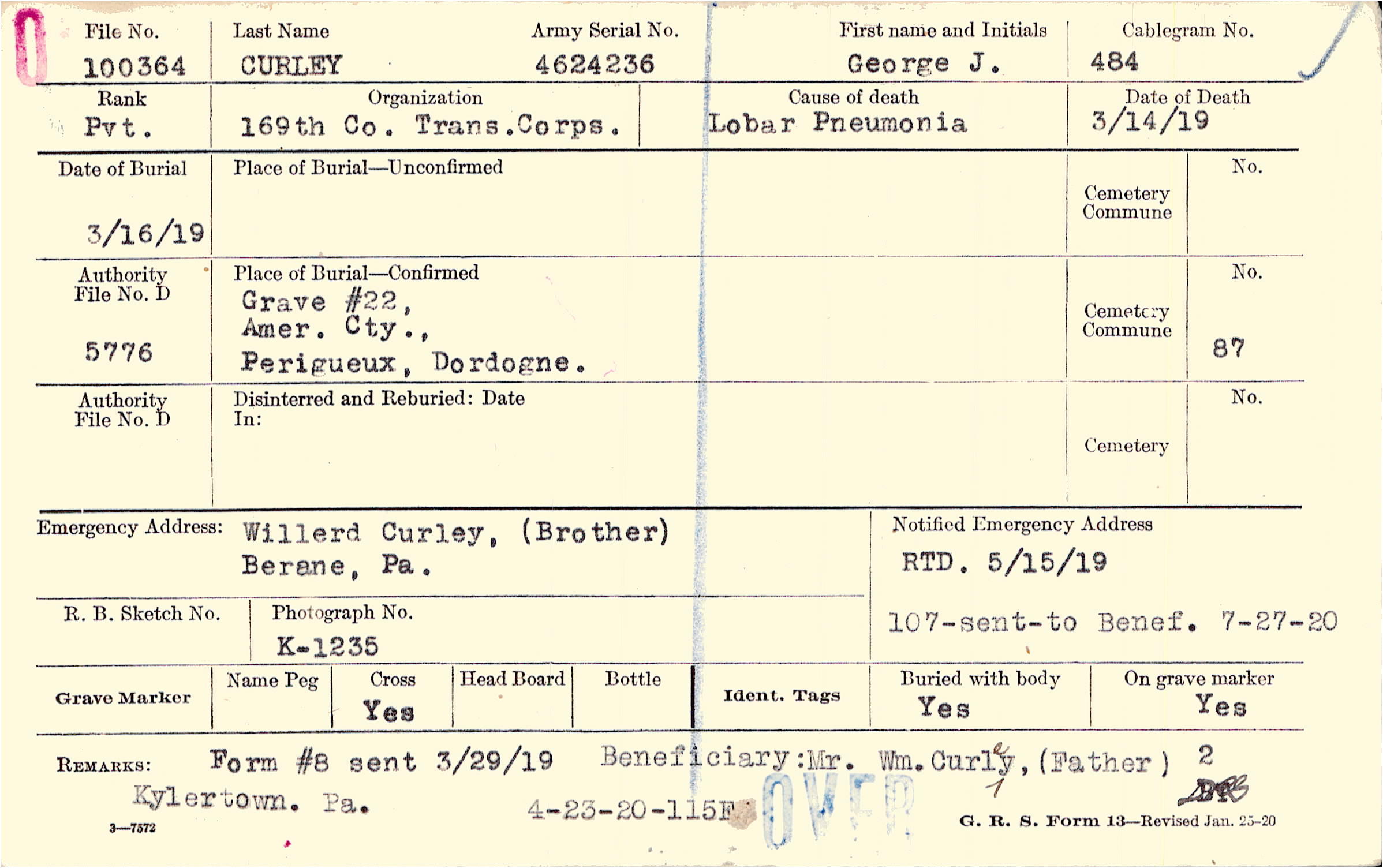RTD 5/15/1919, Form 107: sent to Benef 7/27/1920