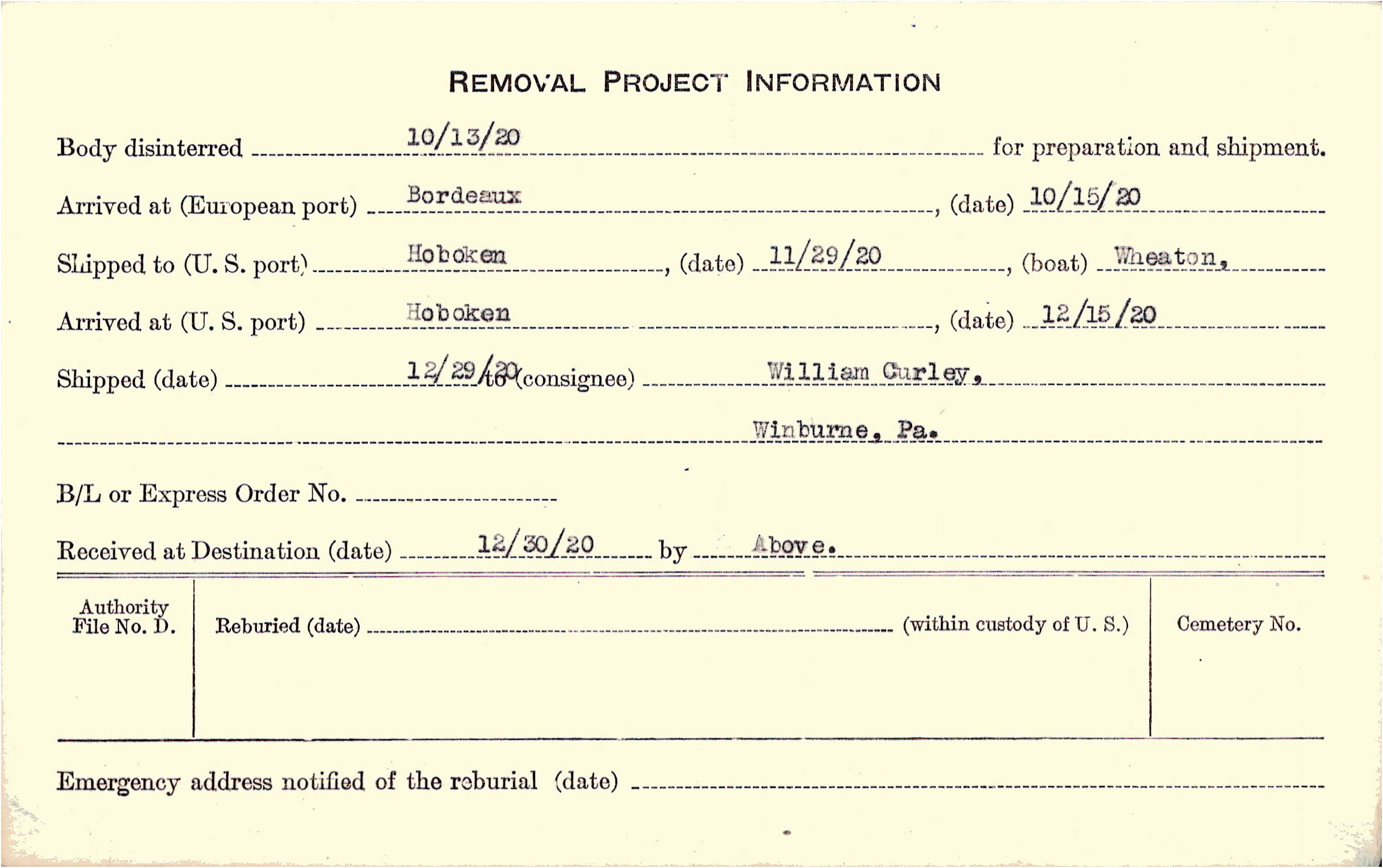 Body disinterred 10/13/1920 for preparation and shipment.