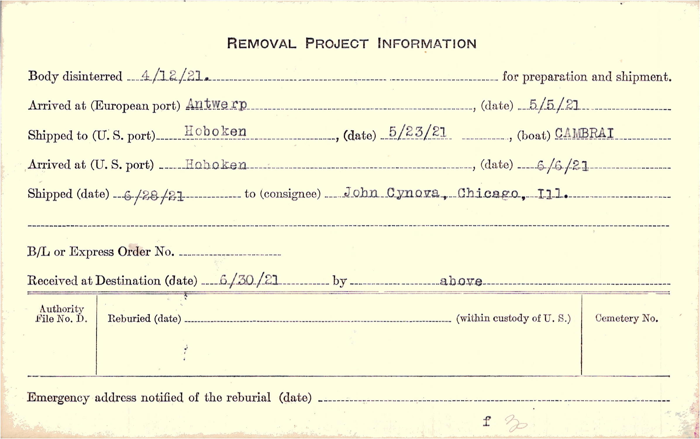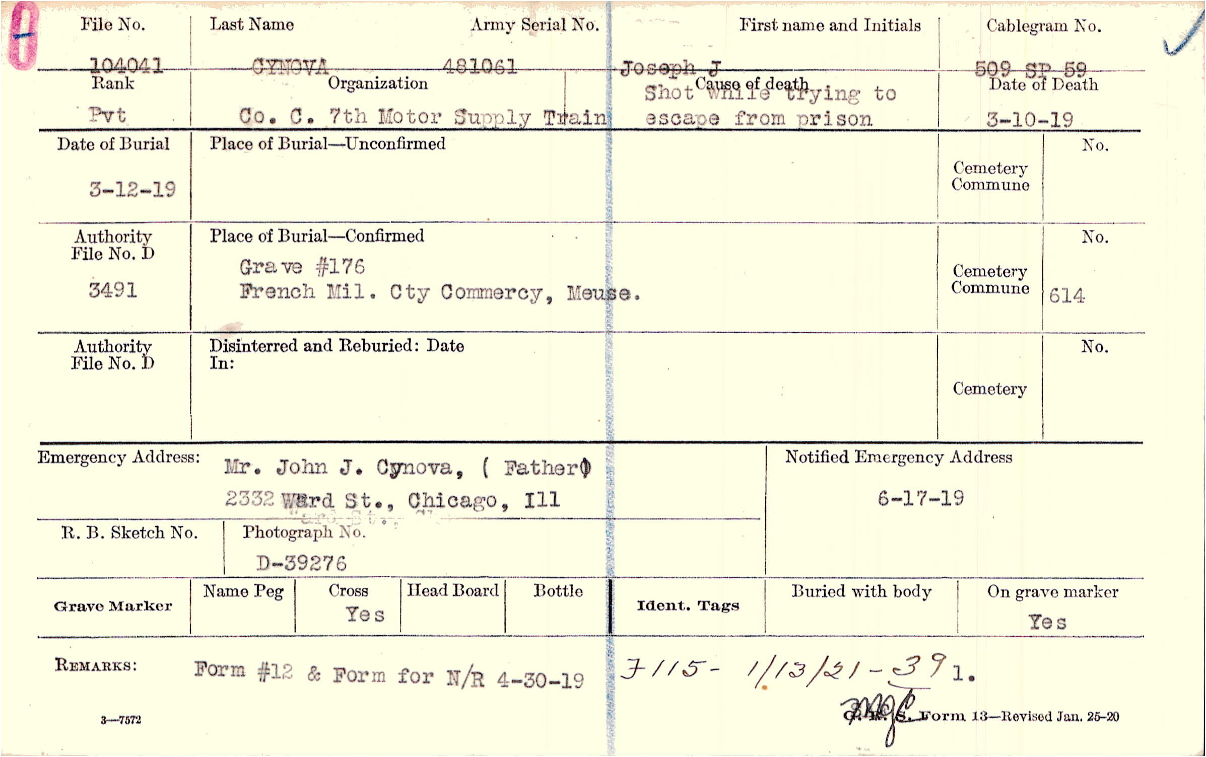 Mr. John J. Cynova, (Father), 2332 Ward St., Chicago, Ill.