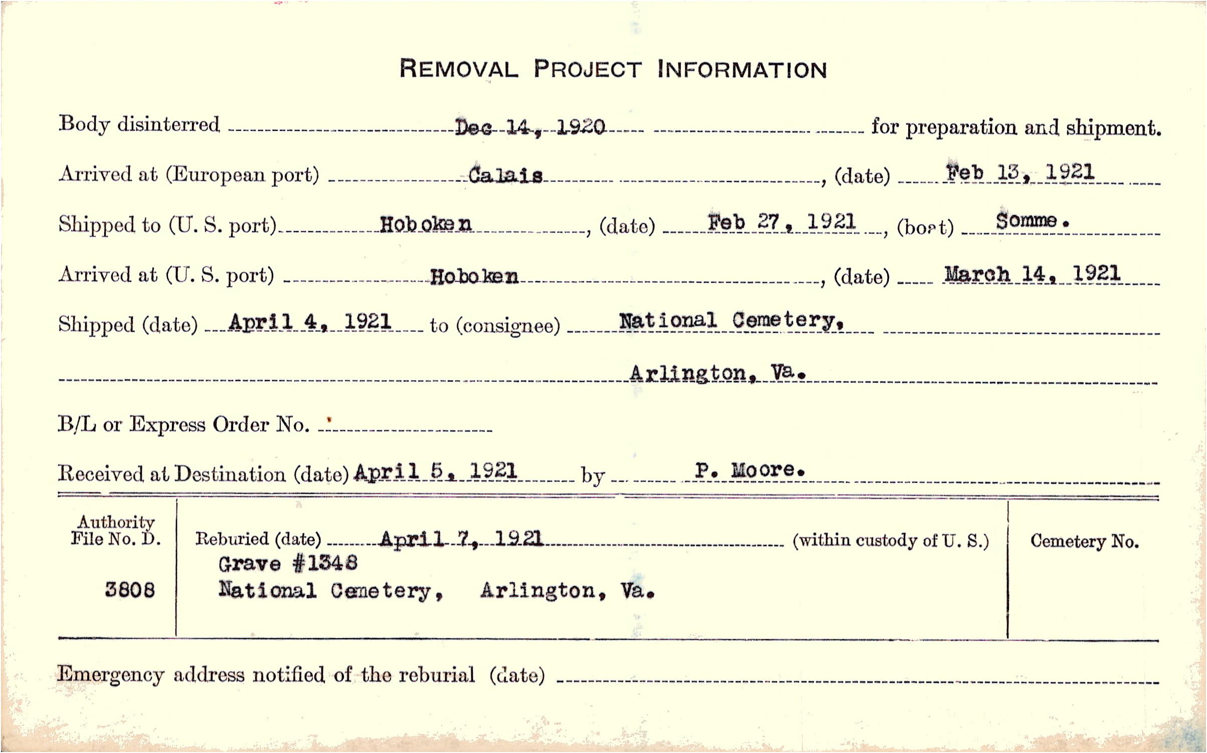 Body disinterred 12/14/1920 for preparation and shipment.