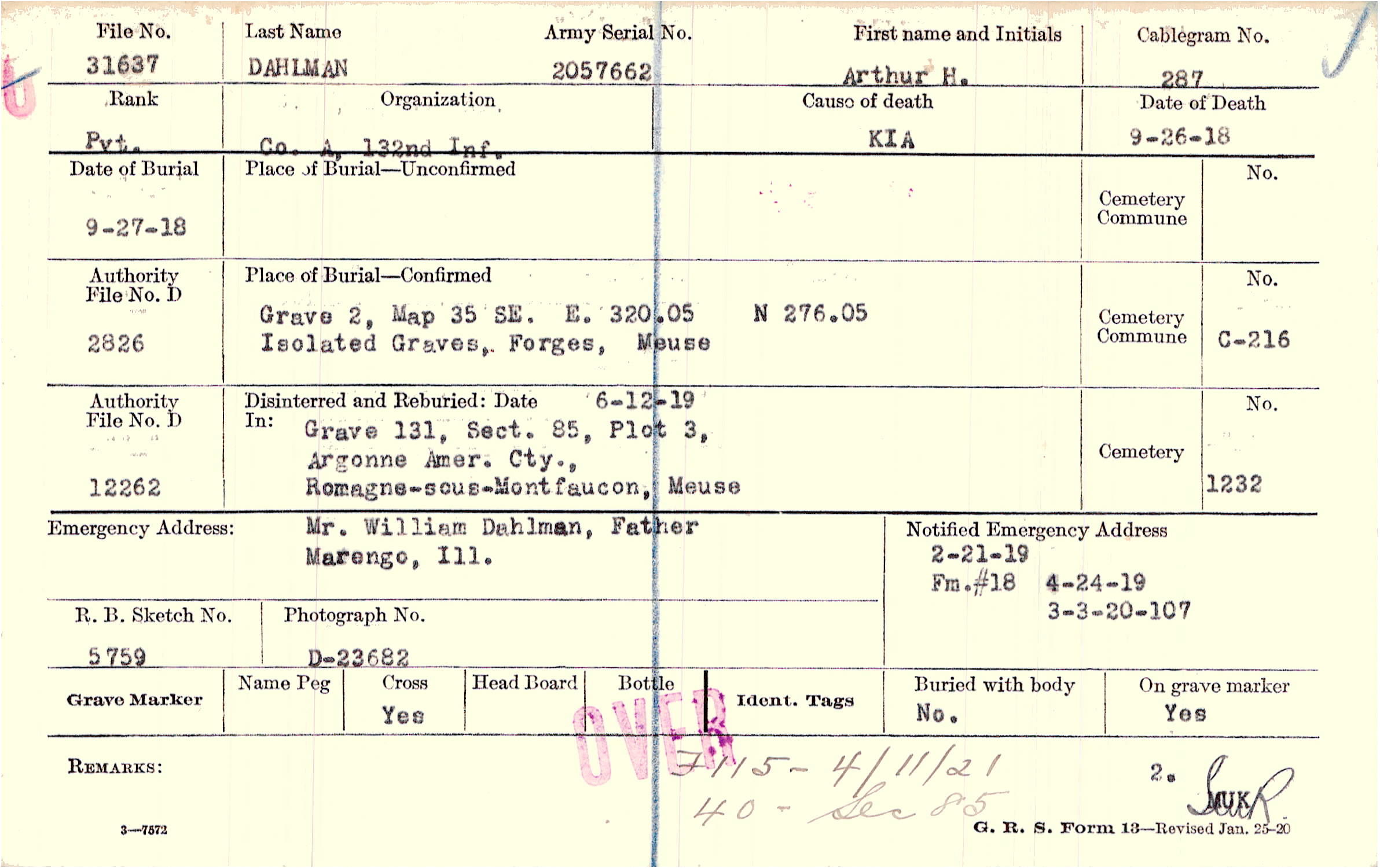 Grave 131, Section 85, Plot 3, Argonne American Cemetery, Romagne-sous-Montfaucon, Meuse