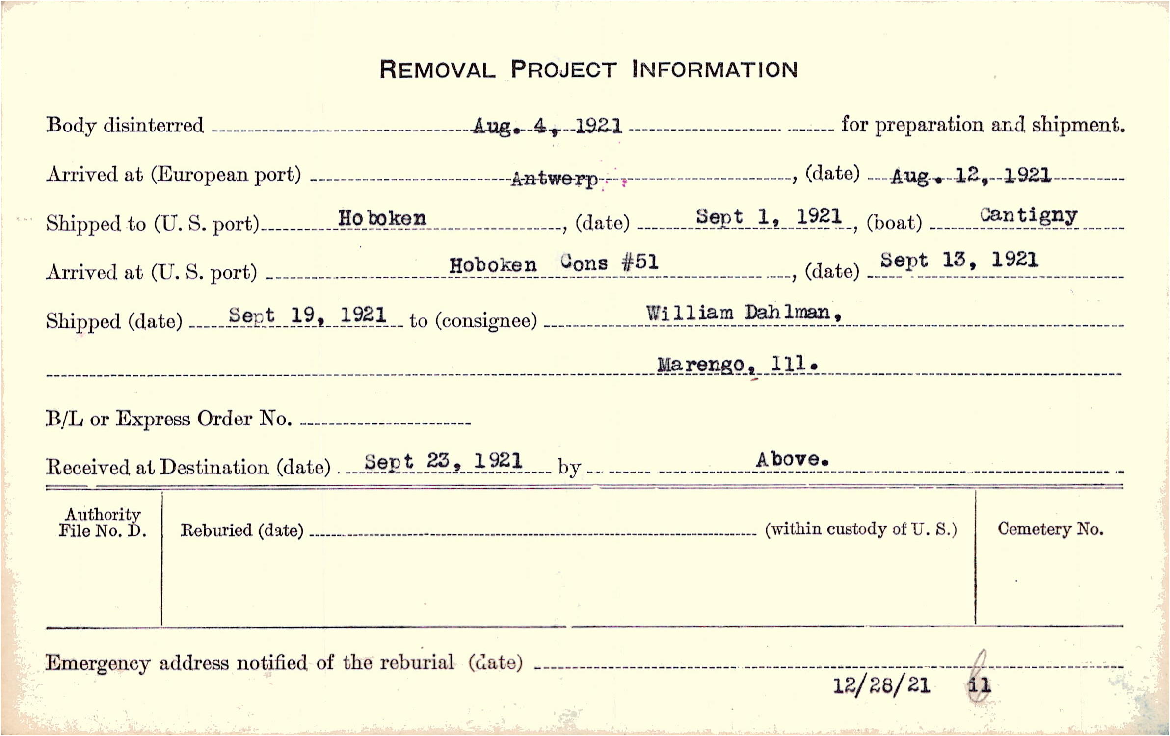 Body disinterred 8/4/1921 for preparation and shipment.