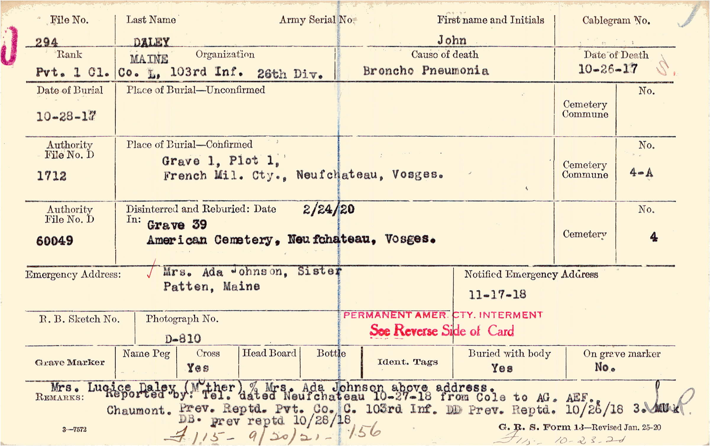 Mrs. Lucice Daley (Mother), % Mrs. Ada Johnson above address. Reported by: Tel. dated Neufchateau 10-27-18 from Cole to AG. AEF.,Chaumont. Prev. Reptd. Pvt. Co. C. 103rd Inf. DD Prev. Reptd. 10/26/18 DB. prev reptd 10/28/18, F115 - 9/20/21 - 156 F115 - 10-23-20