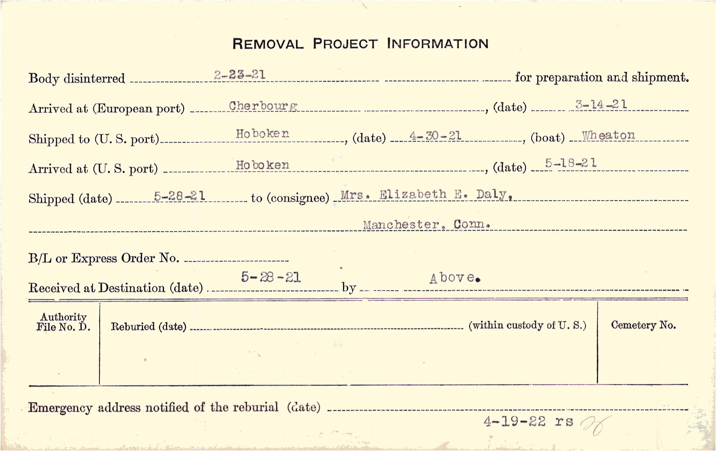 | Emergency address notified on 4/19/1922 |