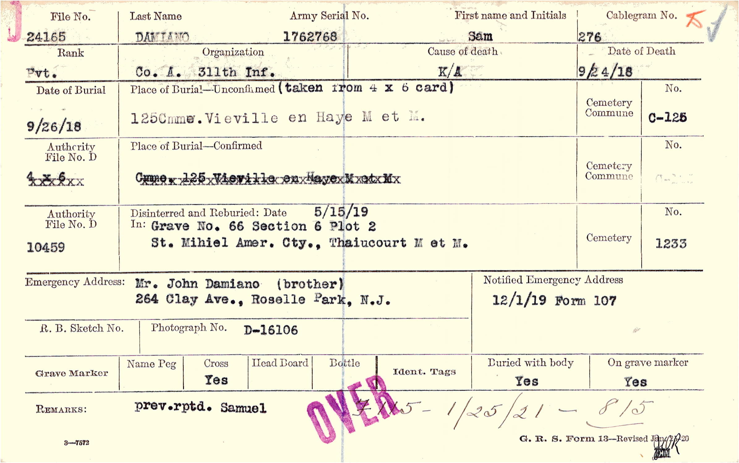 Mr. John Damiano (brother), 264 Clay Ave., Roselle Park, N.J.