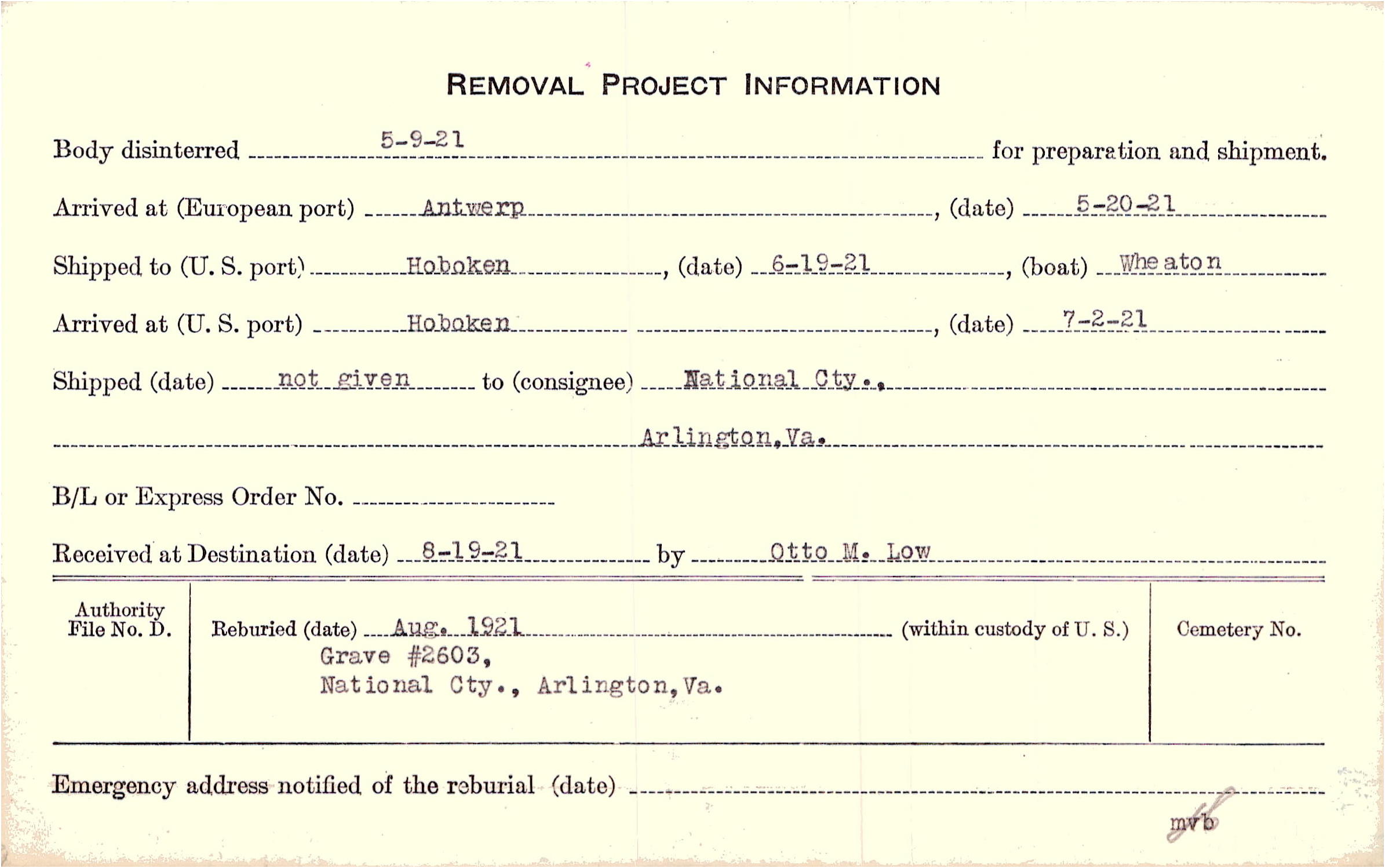 Body disinterred 5/9/1921 for preparation and shipment.