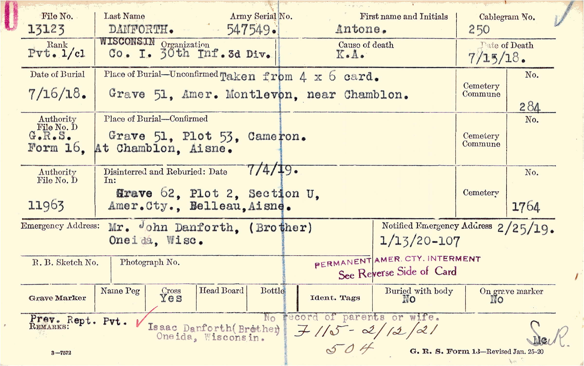Prev. Rept. Pvt. No record of parents or wife. Isaac Danforth (Brother), Oneida, Wisconsin., F115 - 2/12/21 504