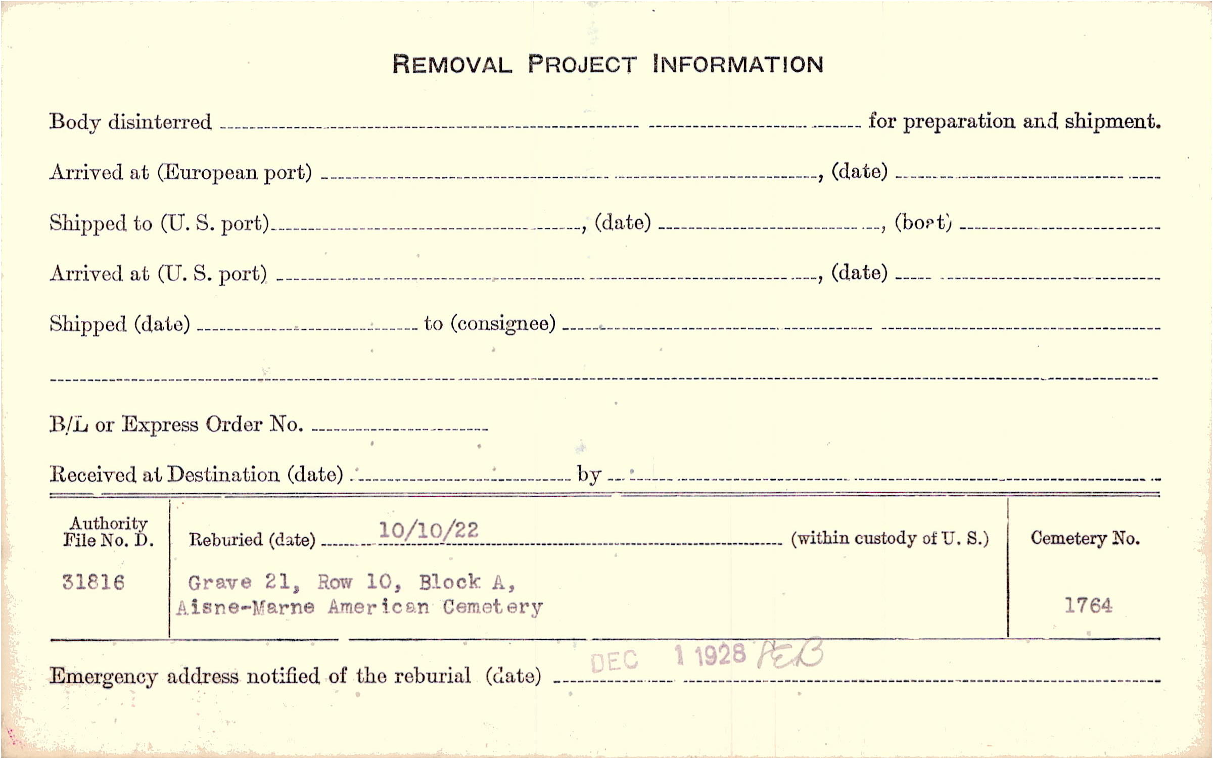 | Permanent Burial in Foreign Cemetery |
