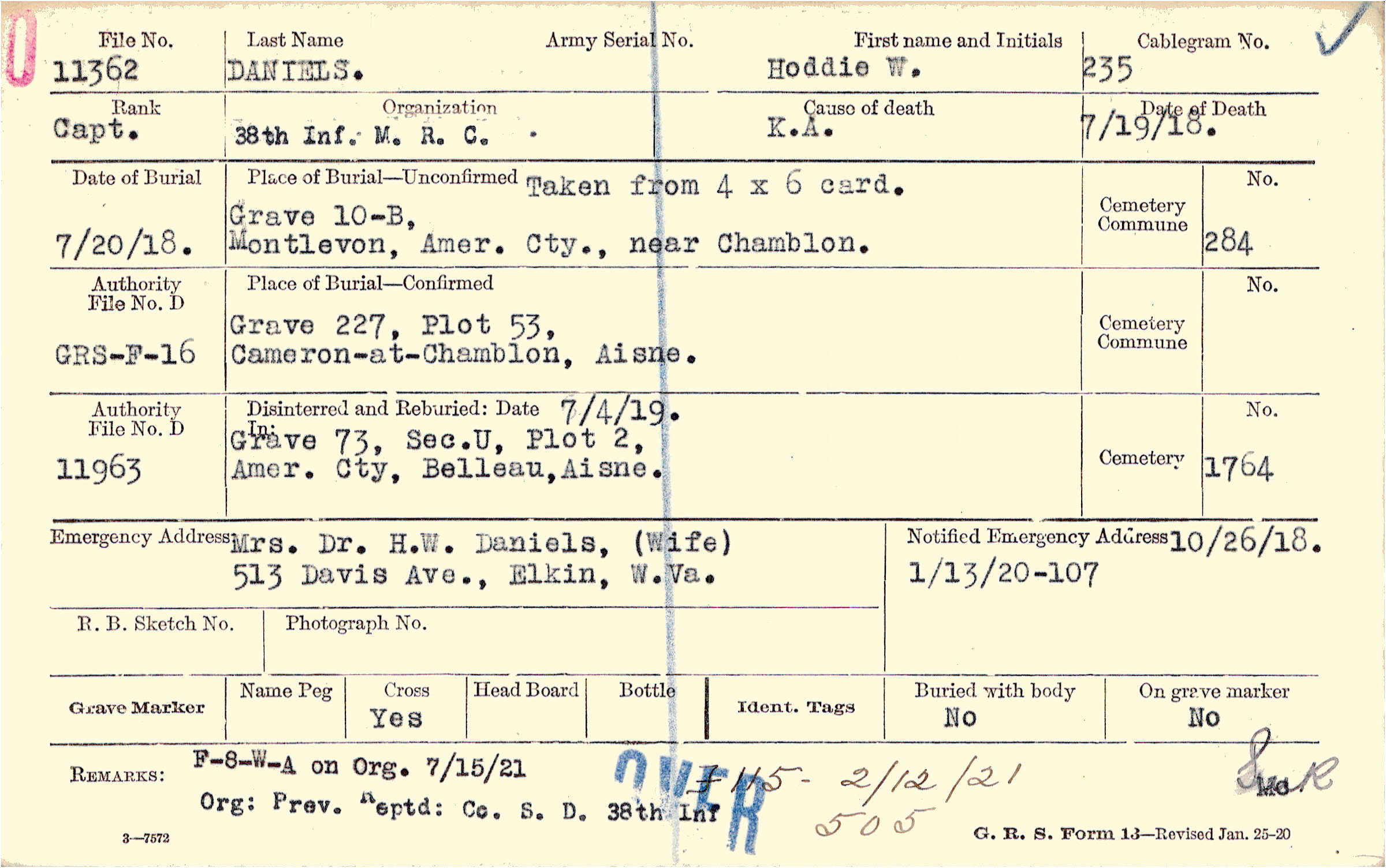 Mrs. Dr. H.W. Daniels, (Wife), 513 Davis Ave., Elkin, W. Va.